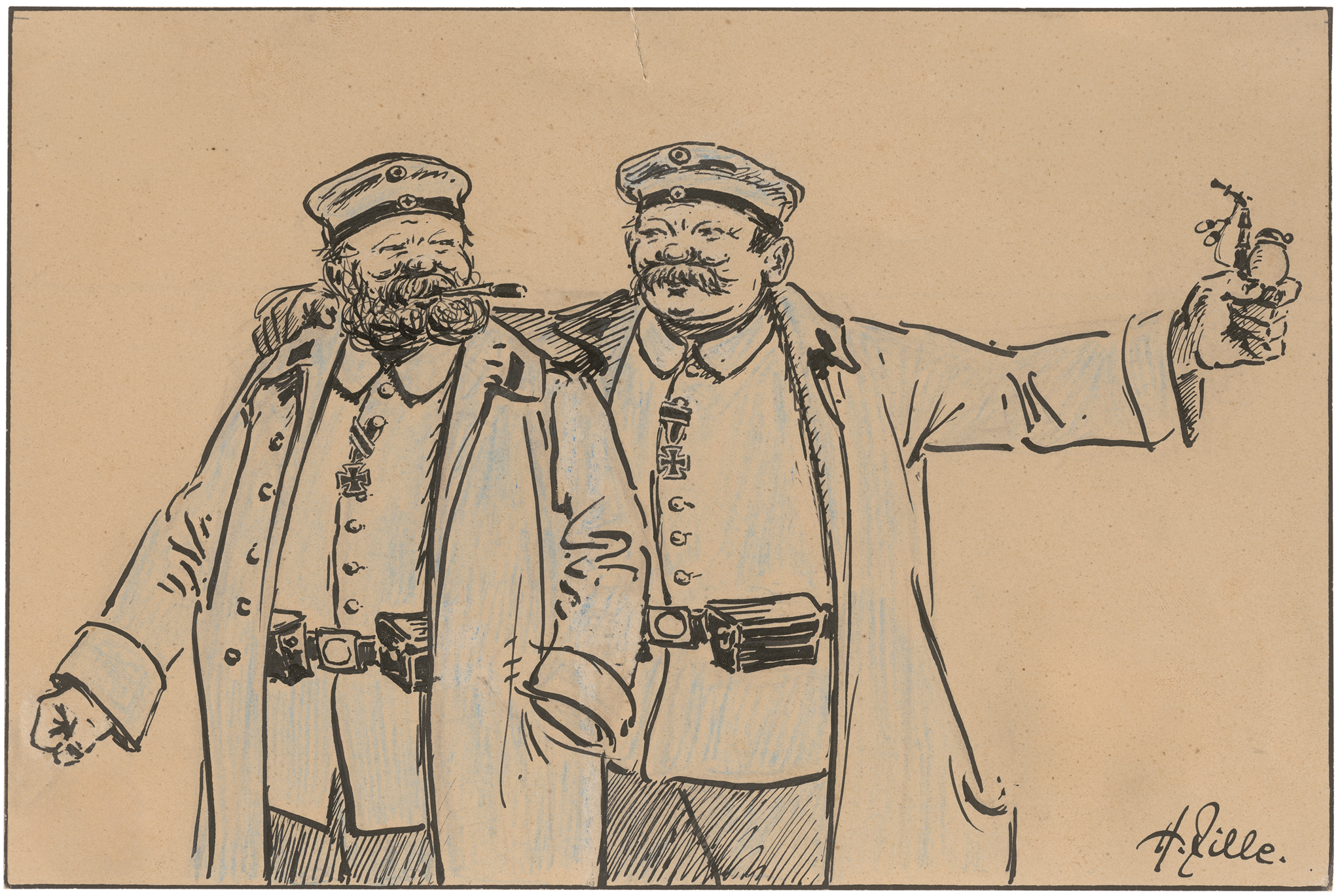Während des Ersten Weltkrieges, in den Jahren 1915 und 1916, zeichnete Zille Folgen von episodischen Soldatenbildern, überwiegend satirischen Charakters. In seiner freien Zeit verarbeitete er in zahlreichen Notizen und Skizzen seine eigenen, zumeist unliebsamen Erlebnisse während seines früheren Militärdienstes in den Jahren 1880 bis 1882. Sie erschienen unter den Titeln "Vadding in Frankreich I und II" und "Vadding in Ost und West". Noch während des Ersten Weltkrieges, um 1917, hatte sich Zille indes zum entschiedenen Kriegsgegner gewandelt. Seine sorgsam ausgeführte Komposition zeigt die beiden Figuren Korl und Vadding, die er damals häufig für die Zeitschrift "Ulk" zeichnete und die sich großer Popularität erfreuten. Das Blatt entstand als Druckvorlage für den Band "Vadding in Frankreich 1916" (Folge 2), erschienen im Verlag der Lustigen Blätter, Berlin 1916, Seite 59. Die Zeichnung ist Prof. Matthias Flügge, Berlin, bekannt.