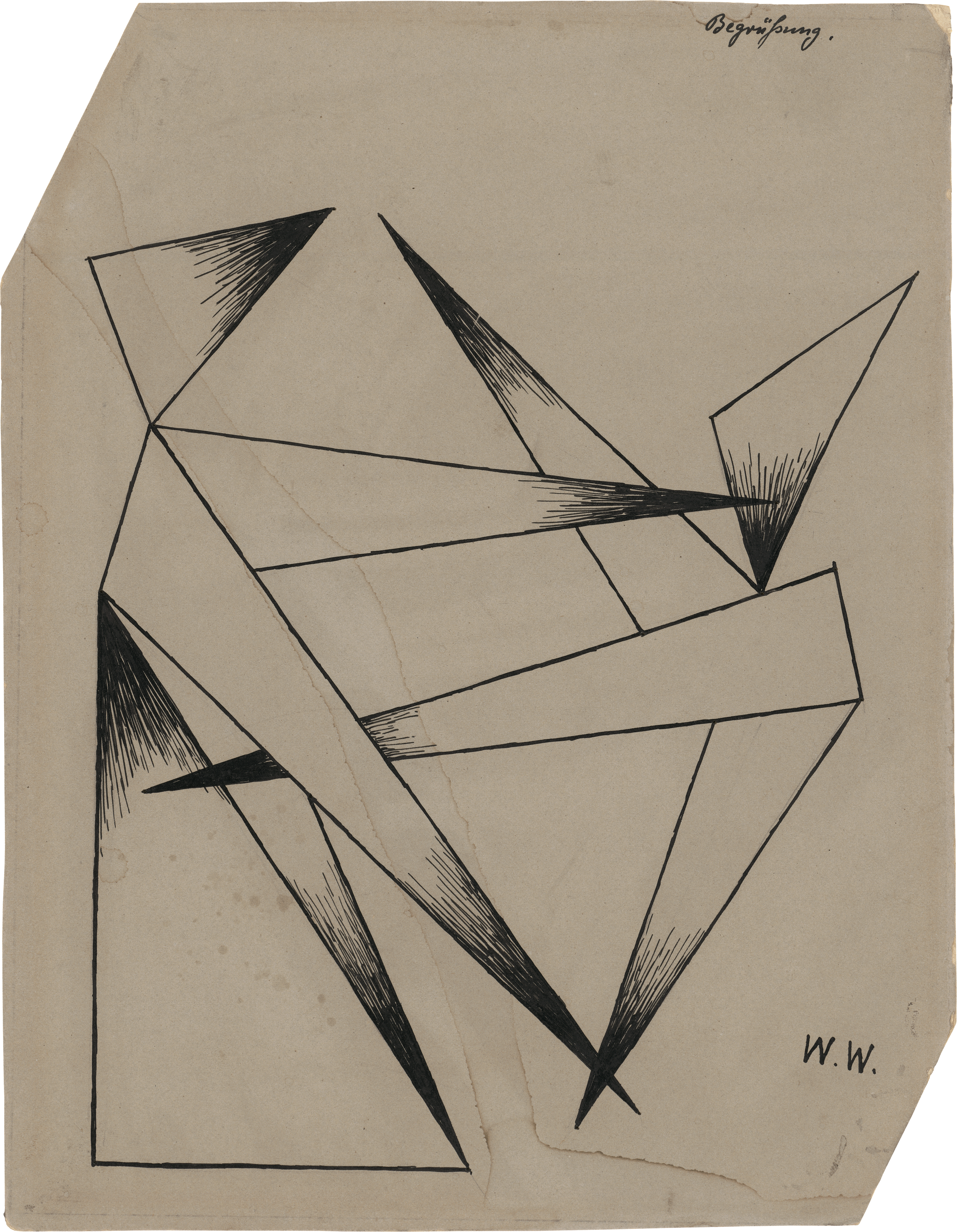 In raumgreifender Dynamik lässt Wauer aus schmalen Dreiecksformen die Begrüßung zweier Figuren entstehen. Die kontrastreiche Wirkung der Federschraffuren in den spitzen Ecken unterstreicht die Räumlichkeit und Bewegtheit der Darstellung. William Wauer, bereits seit 1912 Mitglied der Künstlergruppe "Der Sturm" in Berlin und dort einer der engsten Mitarbeiter Herwarth Waldens, zeichnet die spitzwinklig abstrahierte Komposition noch vor seiner Zeit am Bauhaus. Beigegeben: Ein Siebdruck desselben Motivs von William Wauer, unten rechts mit der Stempelsignatur.