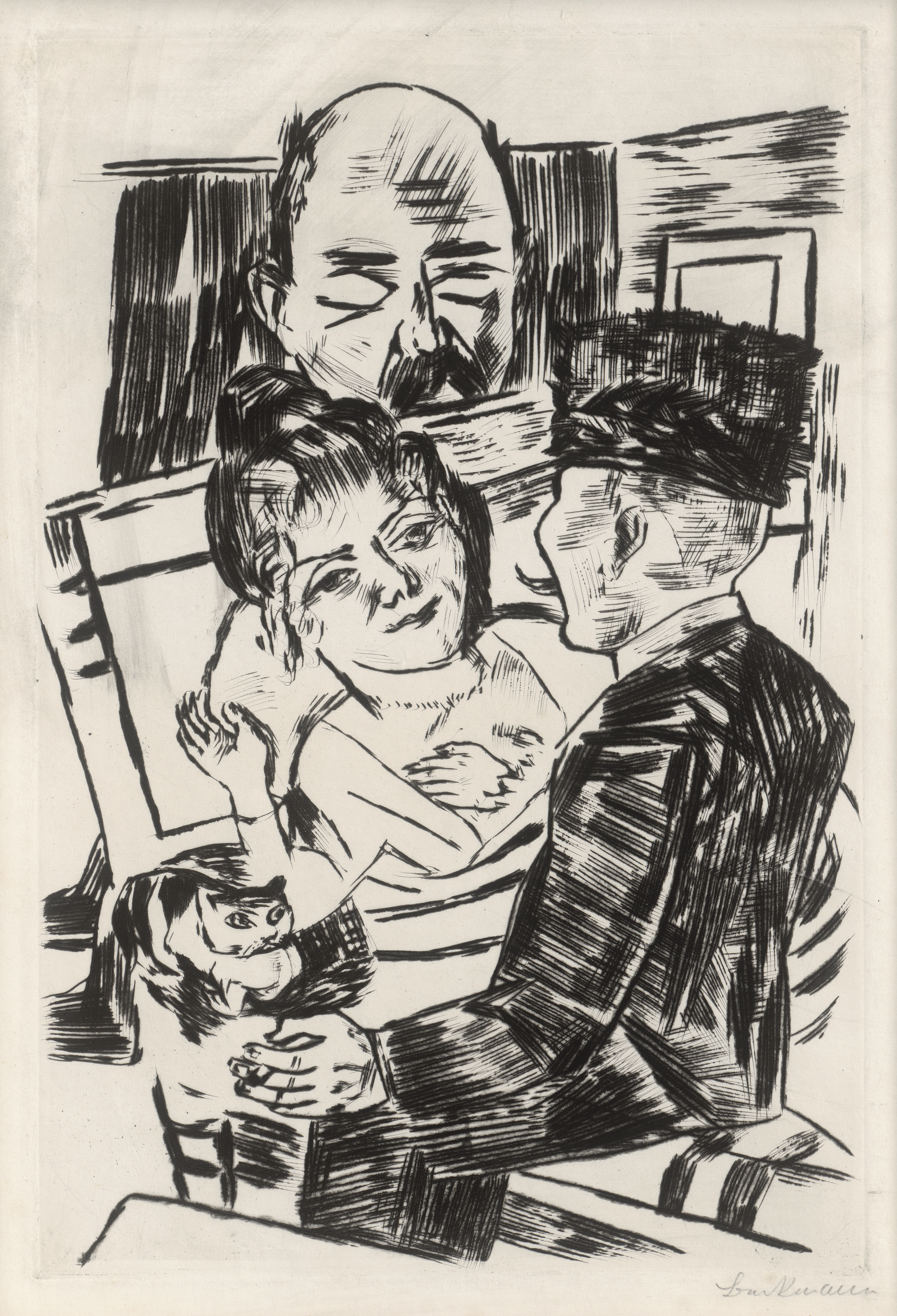 Bei den Dargestellten handelt es sich laut Hofmaier um das mit Beckmann befreundete Ehepaar Fridel und Ugi Battenberg, bei denen er zwischenzeitlich wohnen und arbeiten durfte, sowie den Pelzmütze tragenden Bruder von Fridel Battenberg, Walter Carl. Aus der kleinen Auflage von 50 Exemplaren auf unterschiedlichen Papieren. Erschienen bei I.B. Neumann, Berlin. Prachtvoller, kräftiger, gratiger Druck mit dem wohl vollen Rand, links und unten mit dem Schöpfrand.