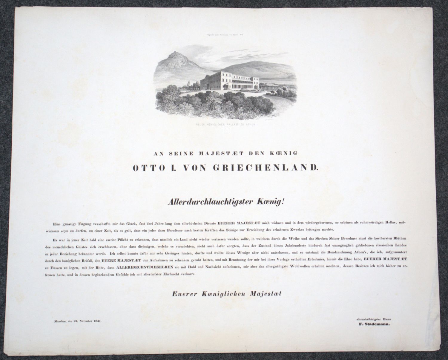 Der aus Berlin gebürtige August Ferdinand Stademann stand seit 1812 in Diensten des bayrischen Staates. 1832 wurde Otto Friedrich Ludwig von Wittelsbach, Sohn Ludwig I. von Bayern, zum König von Griechenland gewählt und Stademann begleitete ihn in dessen Gefolge nach Griechenland. Dort schuf er, angeregt durch die griechische Landschaft und zu Ehren des Königs, die monumentalen Ansichten der vorliegenden Folge: ein prächtiger Atlas mit dem Panorama der griechischen Hauptstadt, das Stademann ganz im Sinne seiner Zeit zeichnete. Die Suite ist auf dem Widmungsblatt König Otto gewidmet. Die erste und einzige Ausgabe der wunderbaren, ikonischen Ansichtenfolge enthält zehn größere Veduten, die zusammengelegt ein Gesamtpanorama von Athen bilden, das durch die Umrisslithographien der Überlagerungsdiagramme und der Referenznummern im Text erläutert wird. Die Lithographien dieses Panoramas zeigen das gesamte Becken der Attika in einer 360-Grad-Ansicht, zusätzlich begleitet von sechs kleineren Darstellungen mit der Akropolis, dem Nympheion, der Athener Innenstadt, Athen gegen Norden, dem Stadion bei Athen und dem Kloster Siriani.