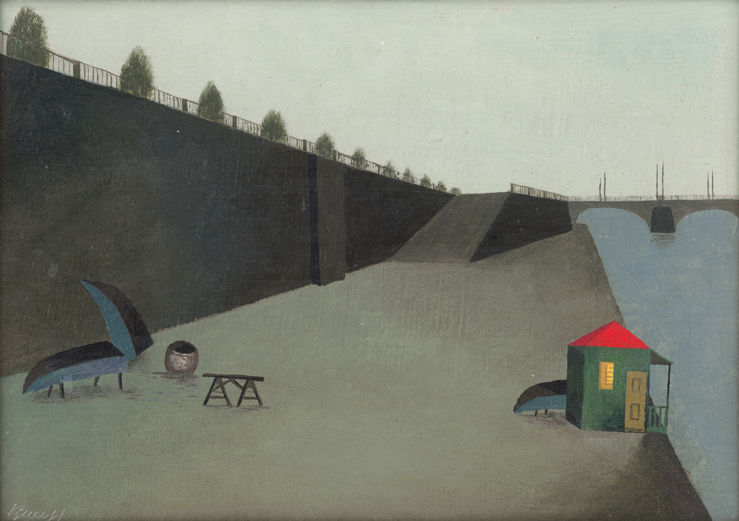 Verlassen ruht ein kleines buntes Häuschen neben dem grauen Fluss, der sich durch die asphaltierte Stadtlandschaft zieht und flankiert wird von einer mit Bäumen gesäumten Straße. Das rote Dach setzt einen reizvollen farbigen Kontrast zu den gedeckten Tönen der Umgebung. Umgekippte und zurückgelassene Boote erinnern an menschliche Aktivität, doch wird die Szene durch den flächigen Farbauftrag anonymisiert und abstrahiert.