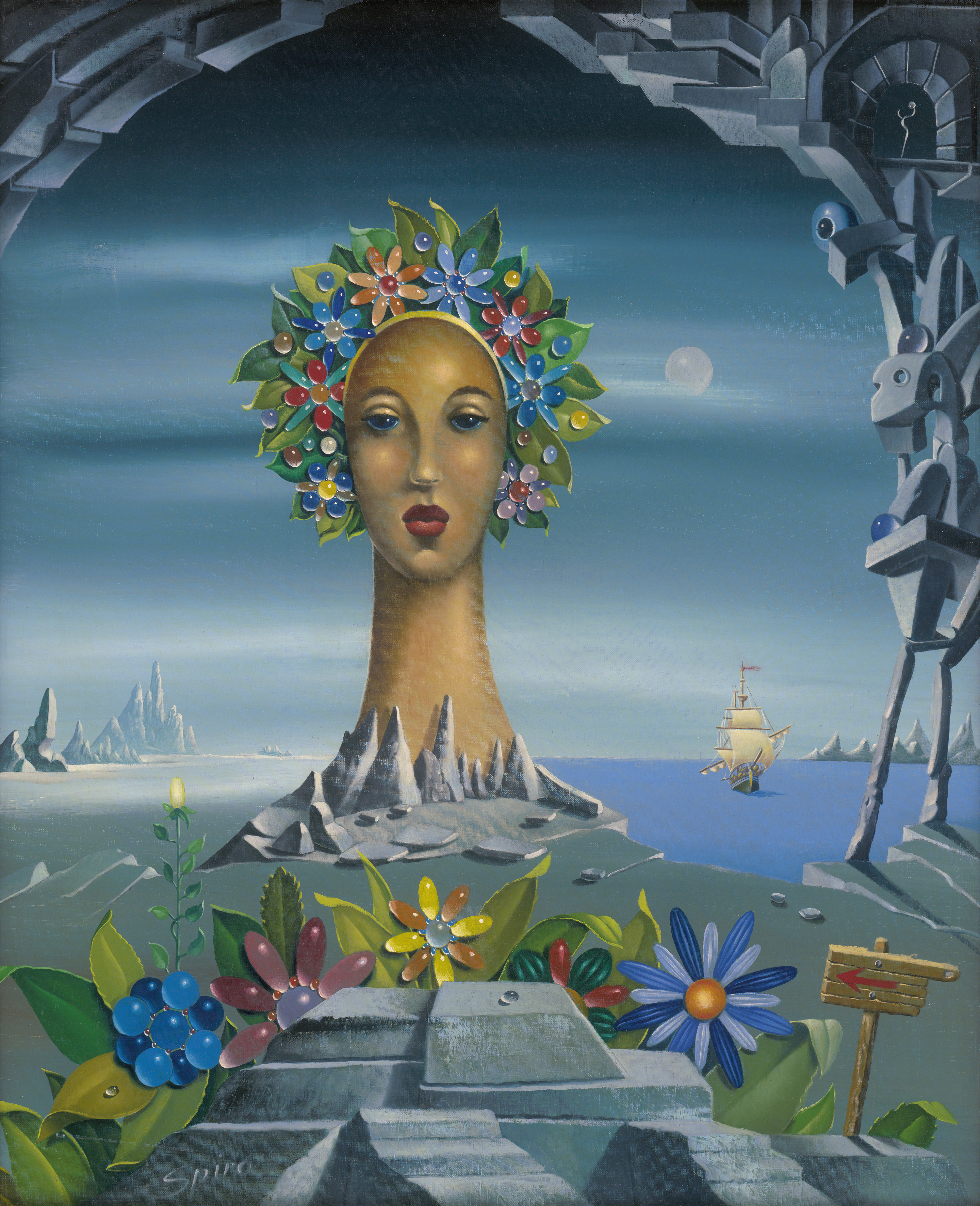 Schlank erhebt sich die monumentale Frauenbüste aus spitzen Felsbrocken inmitten der endlos weiten Ebene. Surrealistische Elemente umgeben die phantastische Gestalt in der blautonigen Landschaft. Mit subtilen Farbabstufungen, plastischer Delikatesse und akribischer Feinheit umgesetzt, entfaltet die Szenerie einen für Spiro charakteristischen skurrilen Reiz. Der an der Wiener Kunstgewerbeschule ausgebildete Künstler war zunächst Journalist, Autor und Spielzeughersteller, widmete sich jedoch nach seiner Flucht aus dem besetzten Österreich nach Frankreich zunehmend der Malerei. Direkt nach dem Zweiten Weltkrieg verkaufte Spiro auf seiner ersten, äußerst erfolgreichen Ausstellung in der L’Arcade Gallery, London, fast alle Werke und lebte nun ausschließlich von seiner Malerei. Georges Spiro verband eine langjährige Freundschaft mit Jean Cocteau.