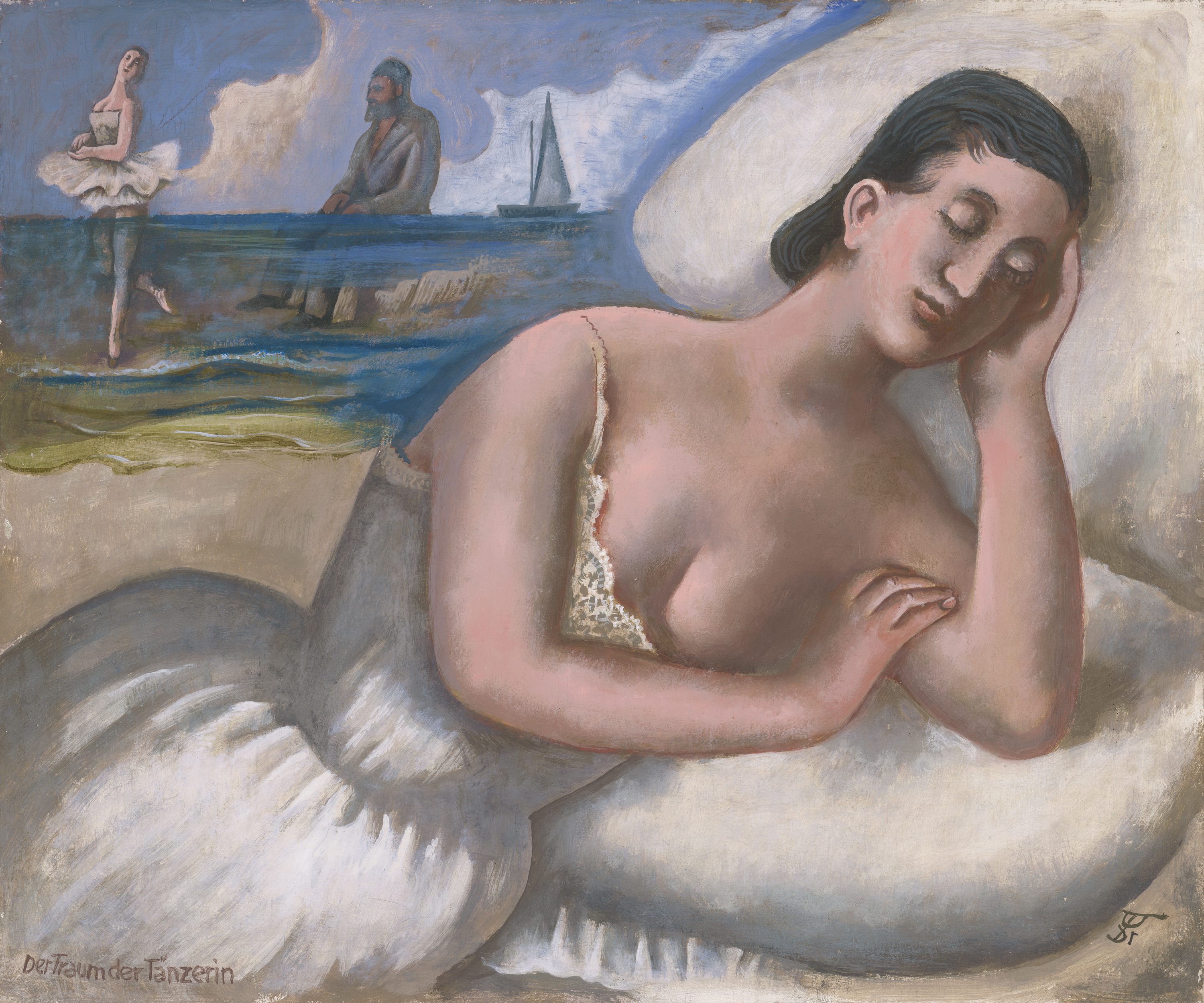 Auf weiche weiße Kissen gebettet, träumt sich die Tänzerin in eine phantastisch-surreale Welt, in der hinter ihr Land und Wasser ineinander verschwimmen. Das blühende, rosa überhauchte Inkarnat steht in spannungsreichem Gegensatz zu der makellosen Plastizität, die die junge Frau starr wie eine Schaufensterpuppe wirken lässt, wie es charakteristisch für Dresslers Bildfiguren ist. In seinem Spätwerk finden sich zunehmend Sujets aus - vielfach artistischen - Randgruppen der Gesellschaft, wie Revuegirls, Gaukler, Balletteusen und Artisten. Dressler, einer der stilprägenden Vertreter der Neuen Sachlichkeit, studierte 1906-13 an den Akademien in Dresden und Leipzig. Anschließend zog er als freischaffender Künstler nach Berlin und schloss sich der Novembergruppe an. 1924 wurde Dressler Mitglied der Berliner Sezession.