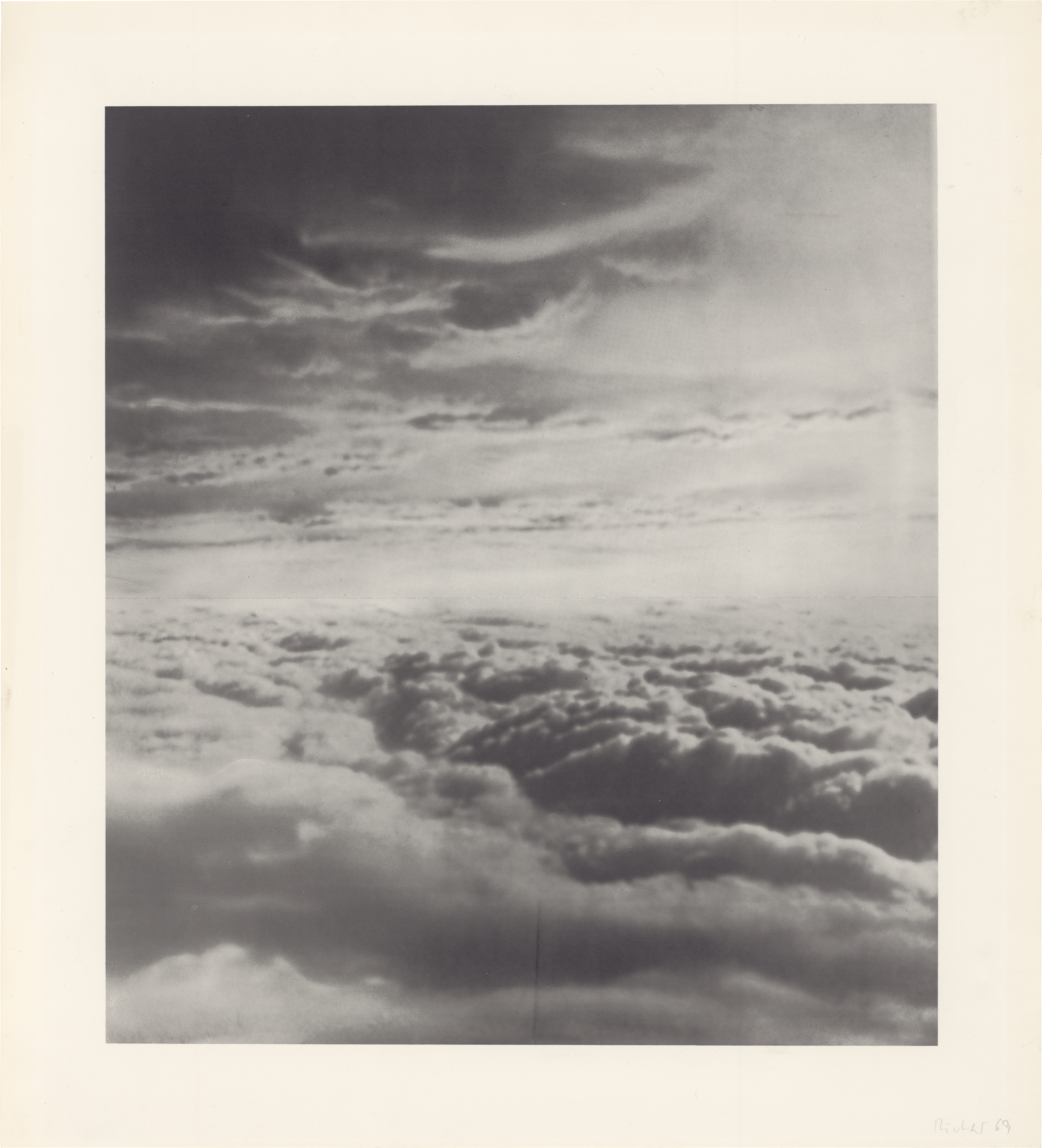 Nach einer Montage von eigenen Fotografien, die Richter auf einer Flugreise aus dem Fenster aufgenommen hatte. Das obere Himmelsmotiv wurde um 180° gedreht. Die Arbeit war Richters Beitrag zur 1970 herausgegebenen Mappe der Hochschule für Bildende Künste in Hamburg, die Arbeiten von allen damaligen Dozenten der Hochschule enthält. Herausgegeben von der Griffelkunst-Vereinigung, Hamburg, ohne den Stempel verso. Die Blattmaße wie häufig abweichend von den Angaben bei Butin. Prachtvoller Druck mit Rand.