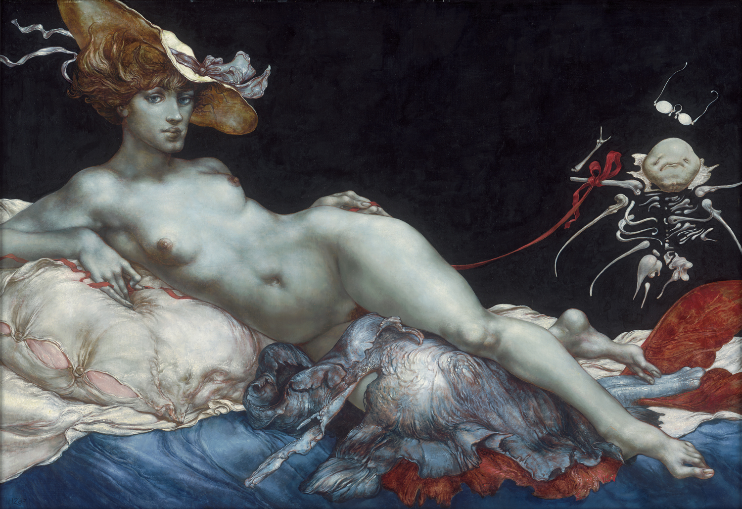 Verführung und Morbides, Reiz und Bedrohung liegen hier dicht nebeneinander. Die Schönheit und die Abgründigkeit der Welt zeigt Zander mit seinem charakteristischen, altmeisterlich wirkenden Malstil. Unterschiedliche Bilderzählungen deuten sich in der Darstellung synchron an, vor allem aber scheint sich Zander auf das Motiv von Venus und Amor am Band zu beziehen. Das sinnlich durchmodellierte Gesicht und der reizvoll drapierte Körper der Frau wirken zunächst anziehend, das marmorbleich-steingraue Inkarnat erschreckt jedoch in seiner Kälte und Perfektion, während das pralle Kissen unter ihrem Oberkörper vergleichsweise lebensvoll erscheint. Erschreckend sind auch die Attribute der liegenden Schönheit: Neben der am roten Bändchen schwebenden Knochenassemblage mit angedeuteten Flügeln liegen unter ihren Beinen unbestimmbare, an die Haut eines Tieres oder einen Vogelbalg erinnernde, schlaff-gewundene Objekte. Besonders effektvoll wirkt die virtuos in detailreicher Manier umgesetzte Szenerie durch den Kontrast mit der Leere des tiefschwarzen Hintergrundes.