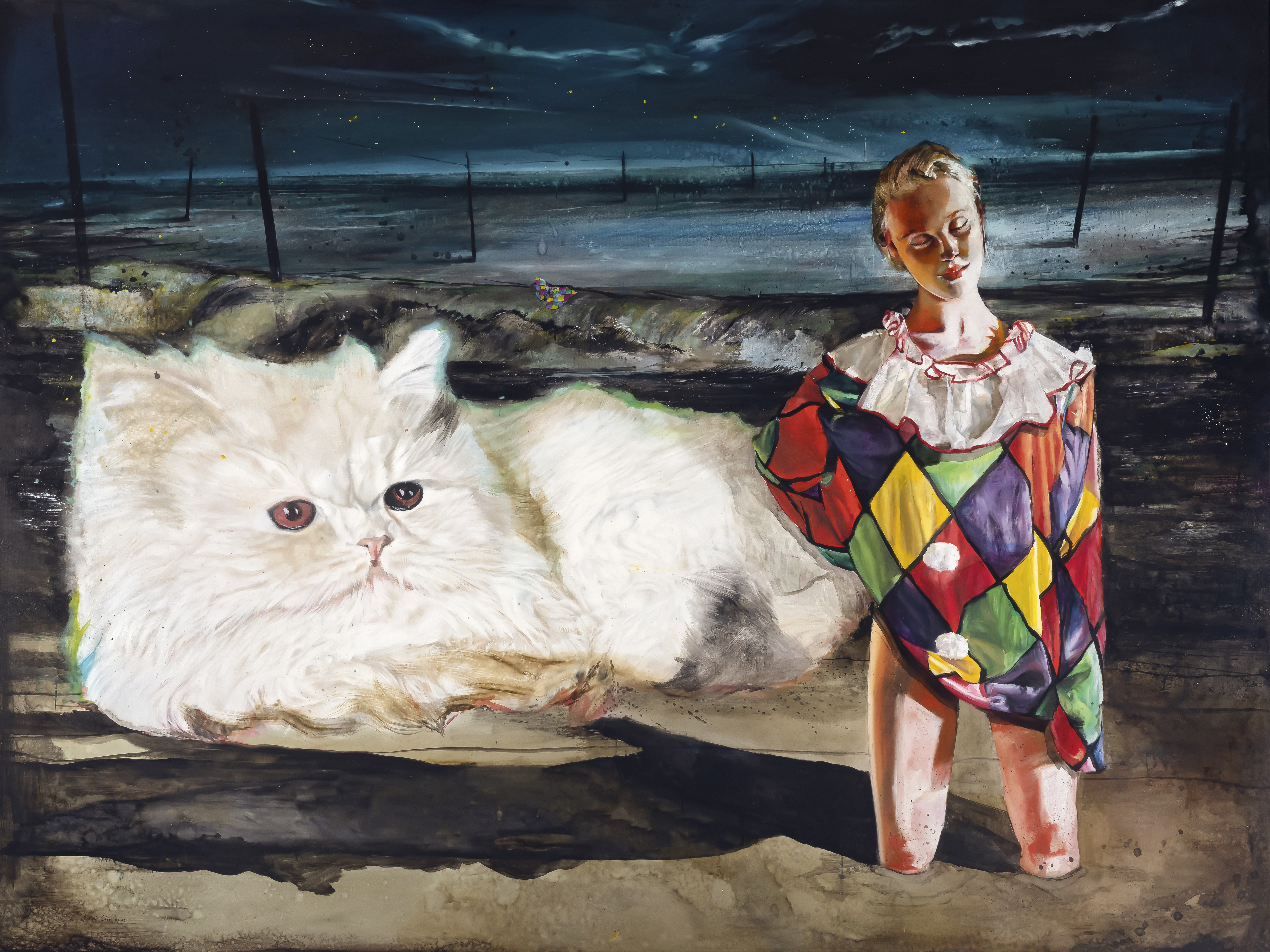 Vor düsterem Himmel und einer apokalyptischen, fast dystopischen Landschaftsszenerie erscheinen die weiße Katze und eine mädchenhafte Figur mit lebloser Haltung im Harlekin-Kostüm. Das weiße Fell der Katze und die leuchtenden Farben des Kostüms stehen in starkem Kontrast zu ihrer düsteren Umgebung. Martin Eder ist bekannt für seine Mischung aus Hyperrealismus, Kitsch und einer verstörenden Ästhetik. Oft kombiniert er niedlich wirkende Tiere mit erotischen oder surrealen Elementen, wodurch ein Gefühl von Verunsicherung entsteht. In diesem Bild wird das vermeintlich Kindliche, Katze und Clown, durch die düstere Szenerie und die unheimliche Stimmung ins Gegenteil verkehrt. Es entsteht ein Spannungsfeld zwischen Schönheit und Bedrohung, Vertrautem und Fremdem. In seinen Arbeiten hinterfragt er kulturelle Werturteile und den Relativismus der Schönheit in der Kunstgeschichte, u.a. durch provokante Darstellungen von Kätzchen, Welpen, Kostümen und den weiblichen sowie männlichen Akt.