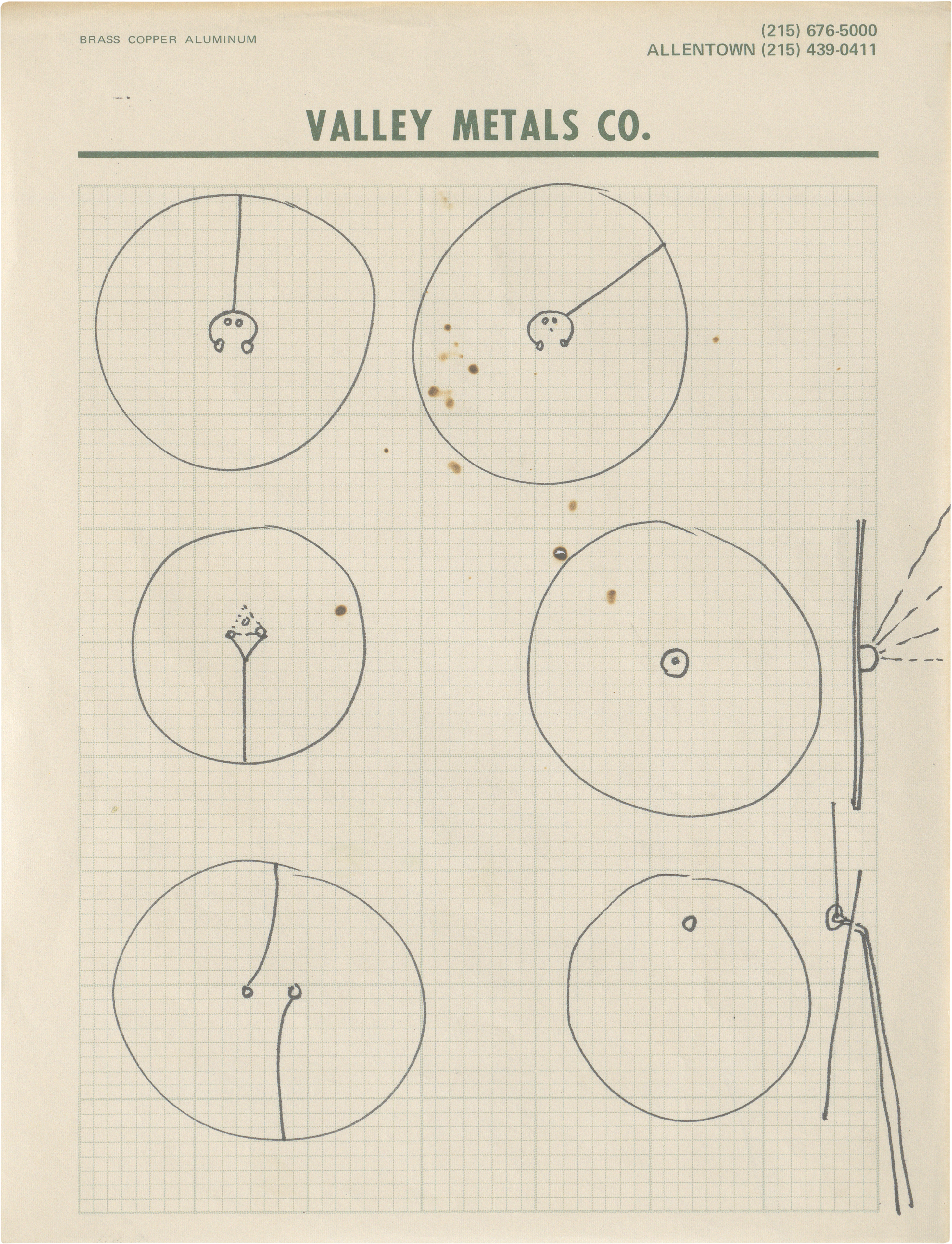 Sechs Gongformen und zwei Seitenansichten der Objekte zeichnet Bertoia auf ein Entwurfspapier der Valley Metals Co., Allentown. Mit Echtheitszertifikat des Nachlasses Harry Bertoia von Celia Bertoia, Utah, 01.06.2022 (in Kopie).