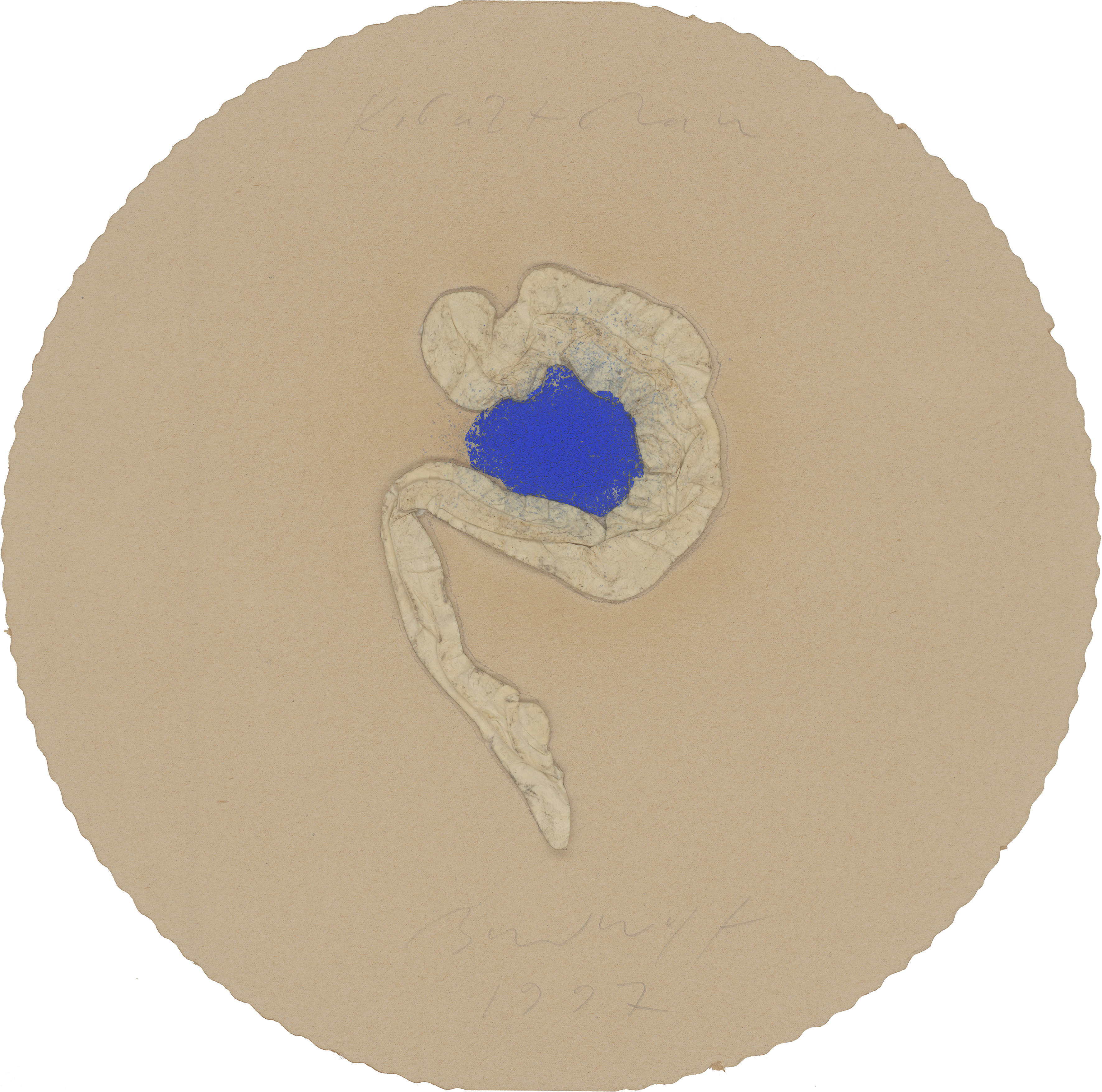 Um den kobaltblauen Pigmentfleck krümmt sich die collagierte, aus Papier gefaltete menschliche Figur und setzt mit ihrer Bewegung das Rund des Untergrundkartons fort.