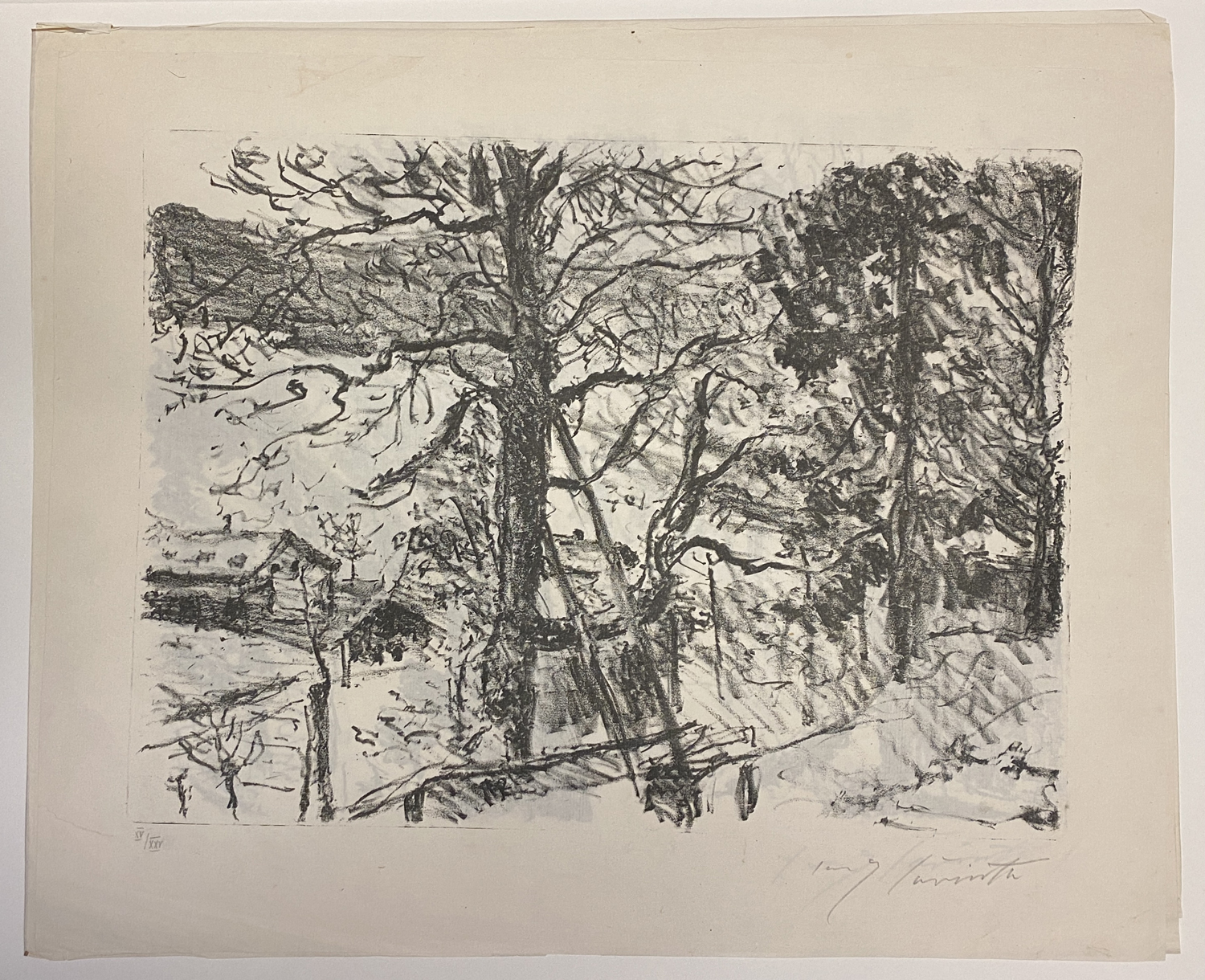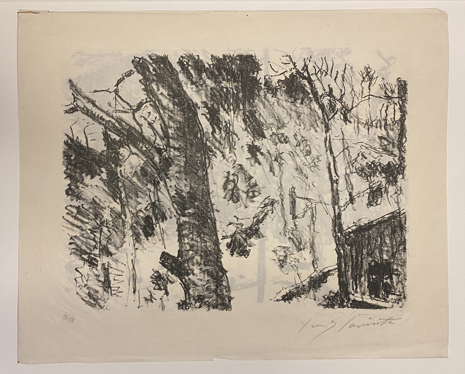Vier (von fünf) Blatt der Mappe "Vorfrühling im Gebirge", erschienen im Euphorion-Verlag, Berlin, in einer Gesamtauflage von 156 Exemplaren. Vorhanden sind die Motive "Frühling am Walchensee", "Berg-See", "Tal-Grund" und "Buchenwald". 1919 kaufte Lovis Corinth ein Grundstück in Urfeld am Walchensee. Sein Haus dort diente dem Künstler als Rückzugsort, wo er auch die Landschaftsmotive der Mappe fand. Gedruckt bei Hermann Birkholz, Berlin. Prachtvolle Drucke mit dem vollen Rand.