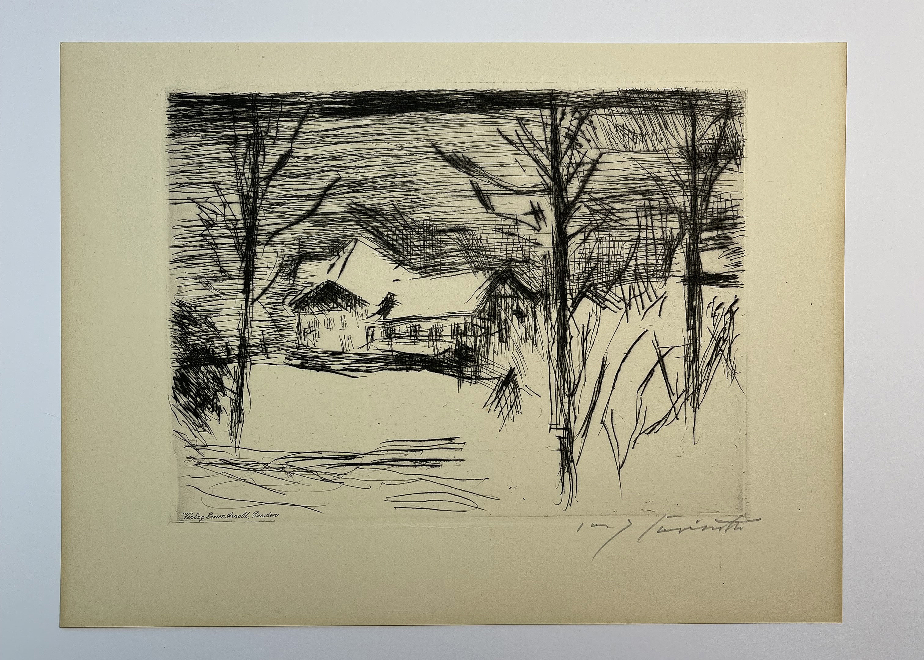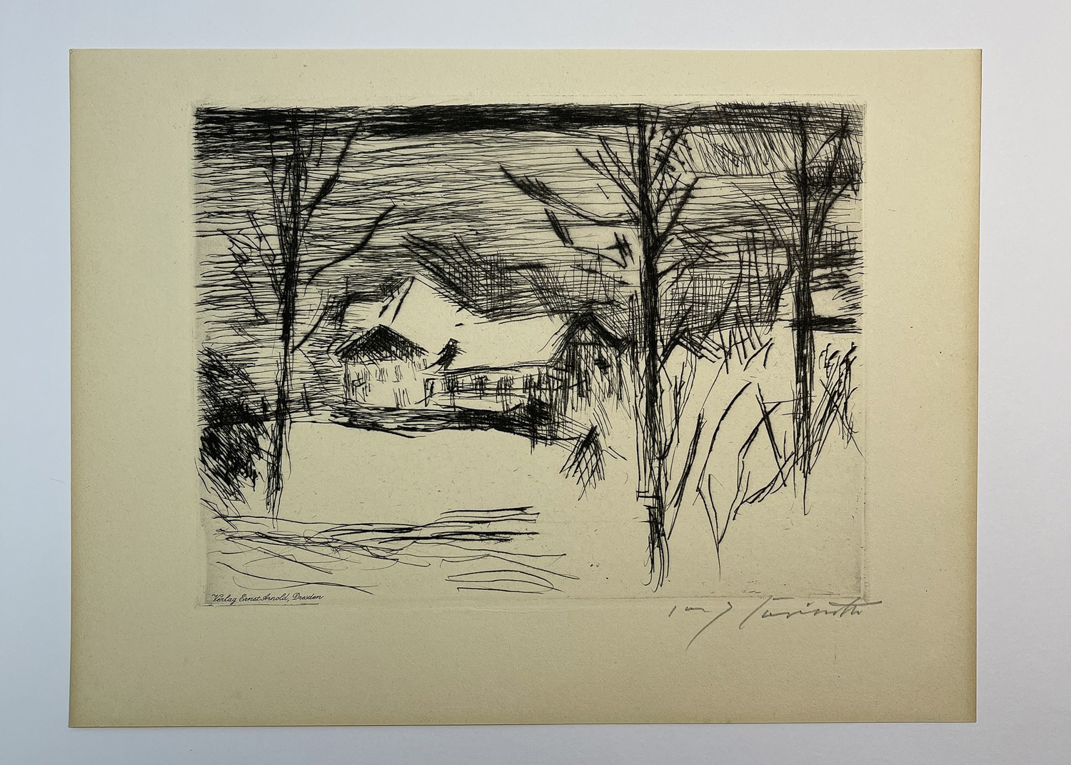 "Walchensee mit Jochberg" aus der Folge "Der Walchensee (klein)", erschienen im Akademie-Verlag, Berlin 1926; "Winter am Walchensee (Hotel Fischer am See)" erschienen in einer Auflage von 200 Exemplaren in der Vorzugsausgabe von "Der Zeichner Lovis Corinth" von Georg Biermann, Verlag Ernst Arnold, Dresden. Beides prachtvolle, tiefdunkle und gratige Drucke mit Rand, teilweise mit dem Schöpfrand.