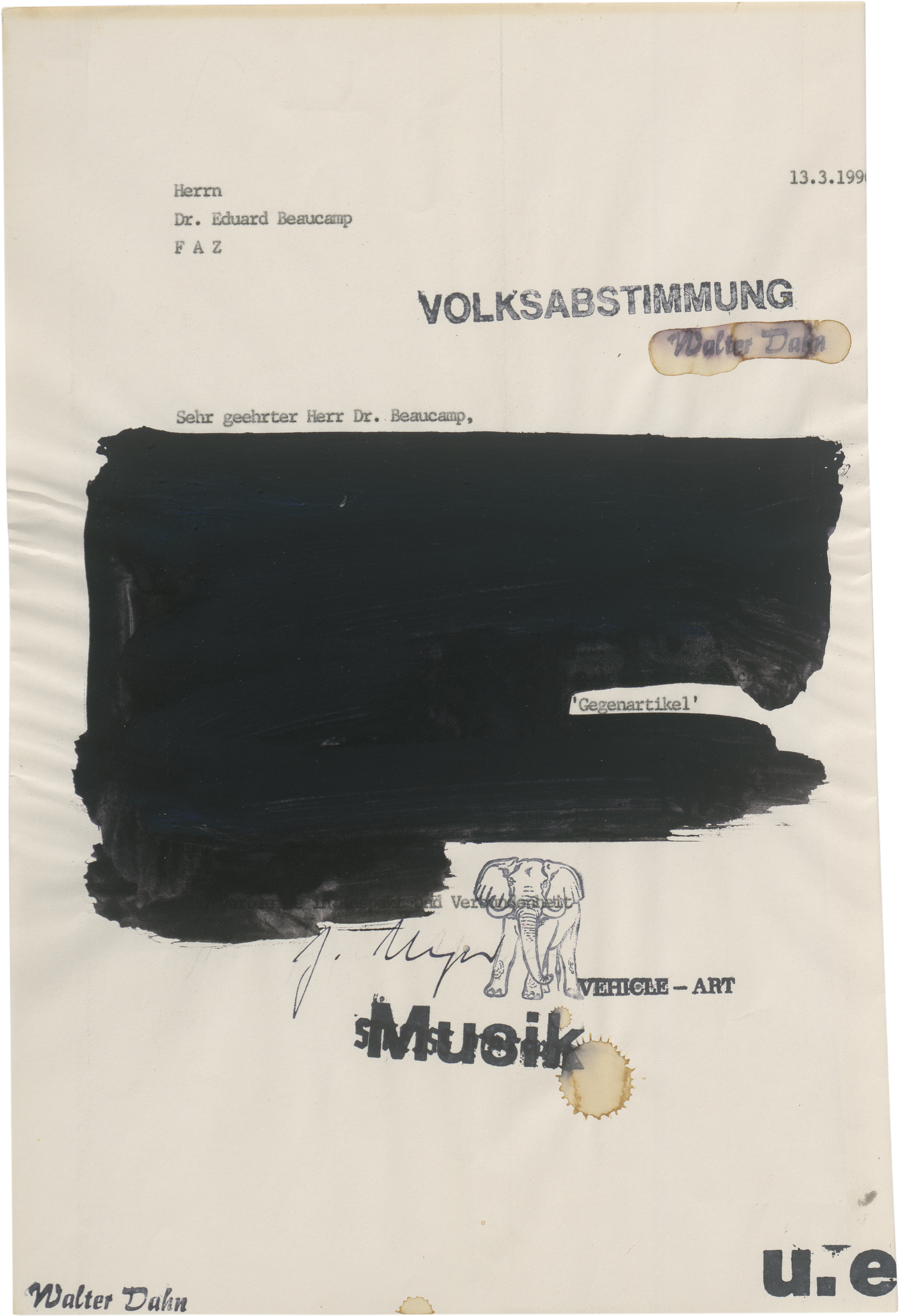 Dahn übermalt und überstempelt einen Brief von Jürgen Meyer an den Kunstkritiker und Publizisten Eduard Beaucamp.
