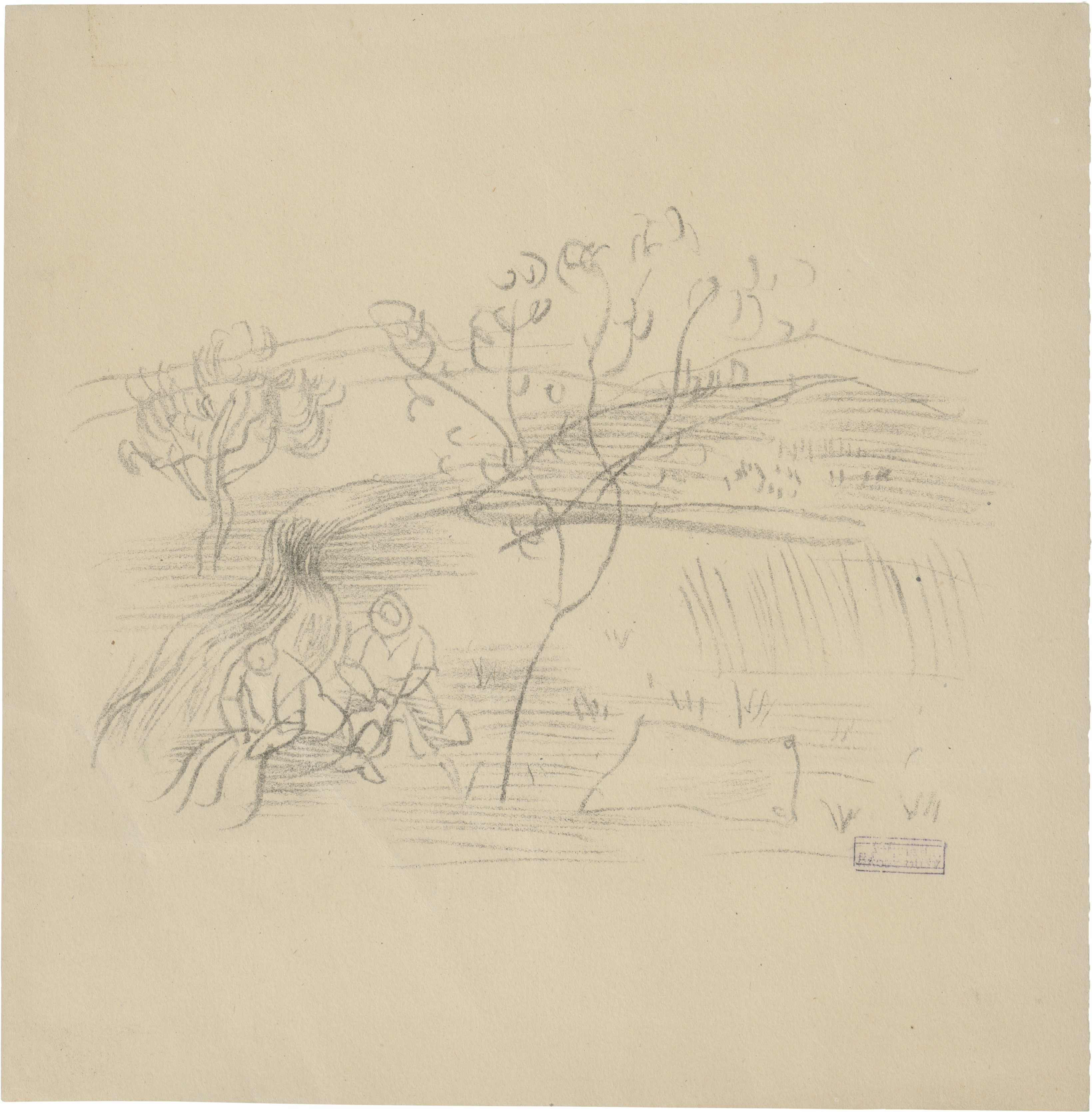 Schwungvoll stilisierte, anmutige Komposition einer ländlichen Szene, in sparsamen, lockeren Konturen und dezenten Schraffuren umgesetzt.