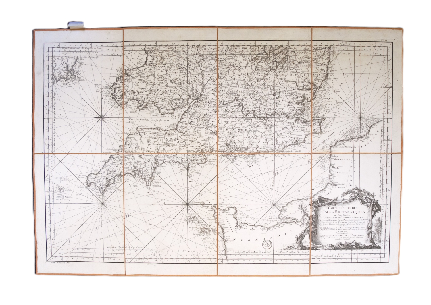 Bellin, Jacques Nicolas. Isles Britanniques. Vier Kupferkarten in je 8 Segmenten auf Leinen aufgezogen. 59 x 90,5 cm (Plattenrand). Roter OLeder-Schuber (etwas berieben, bestoßen sowie fleckig) in Form eines Buches mit goldgeprägtem RSchild, Rück- und Deckelvergoldung sowie dreiseitigem Goldschnitt. Paris 1757.