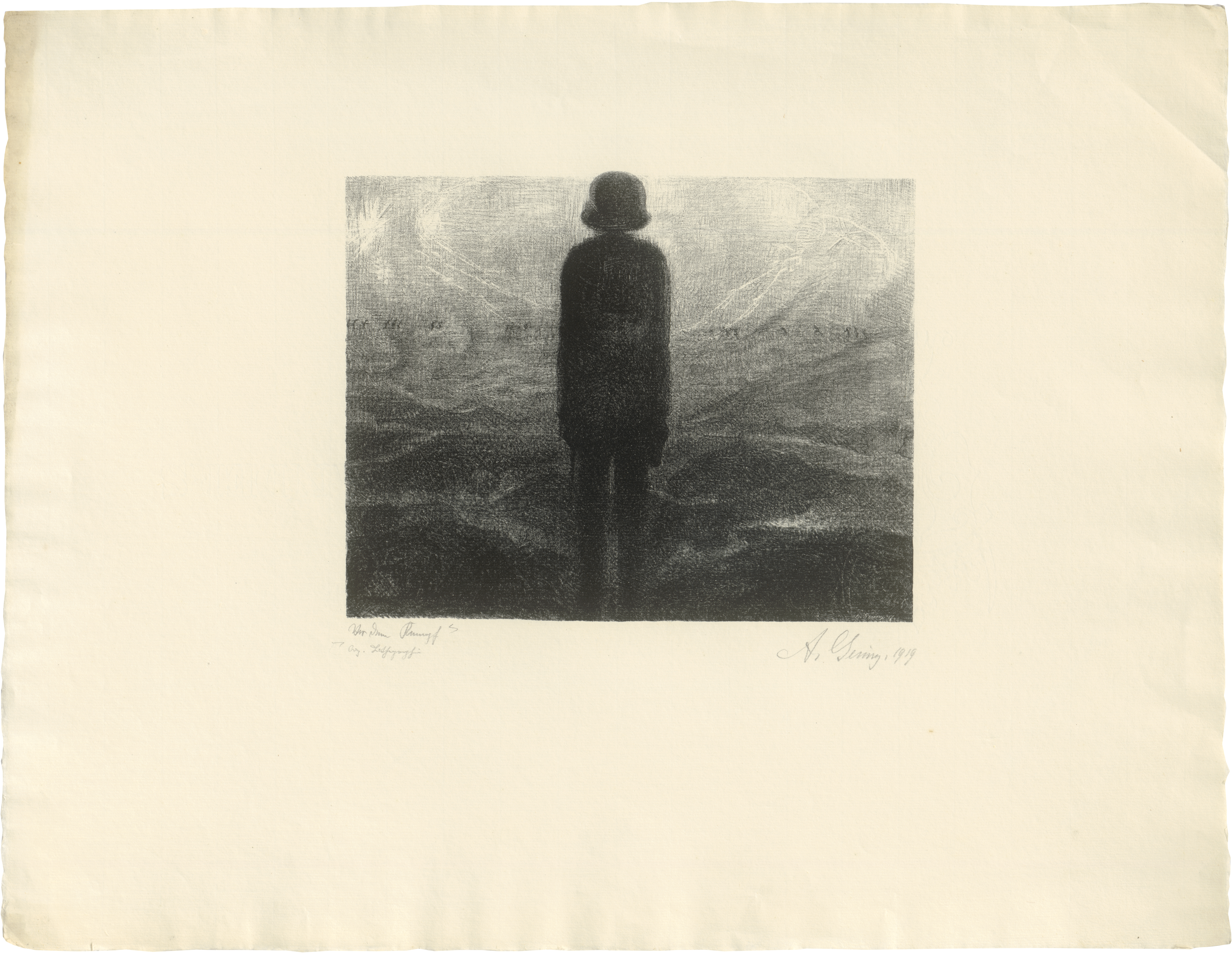 Als gelernter Graphiker setzte sich Gering vor allem in seinem umfangreichen druckgraphischen Œuvre intensiv mit den Gräueltaten des Ersten Weltkrieges auseinander. In dieser Lithographie schildert er den Moment vor dem Kampf. Durch die Ansicht des Soldaten als Rückenfigur fühlt man als Betrachter mit und versetzt sich in die alternativlose, bedrohliche Situation des jungen Mannes bei seinem Blick auf das Schlachtfeld. Kräftiger, im Streiflicht leicht glitzernder und fein differenzierter Druck mit dem vollen, sehr breiten Schöpfrand.