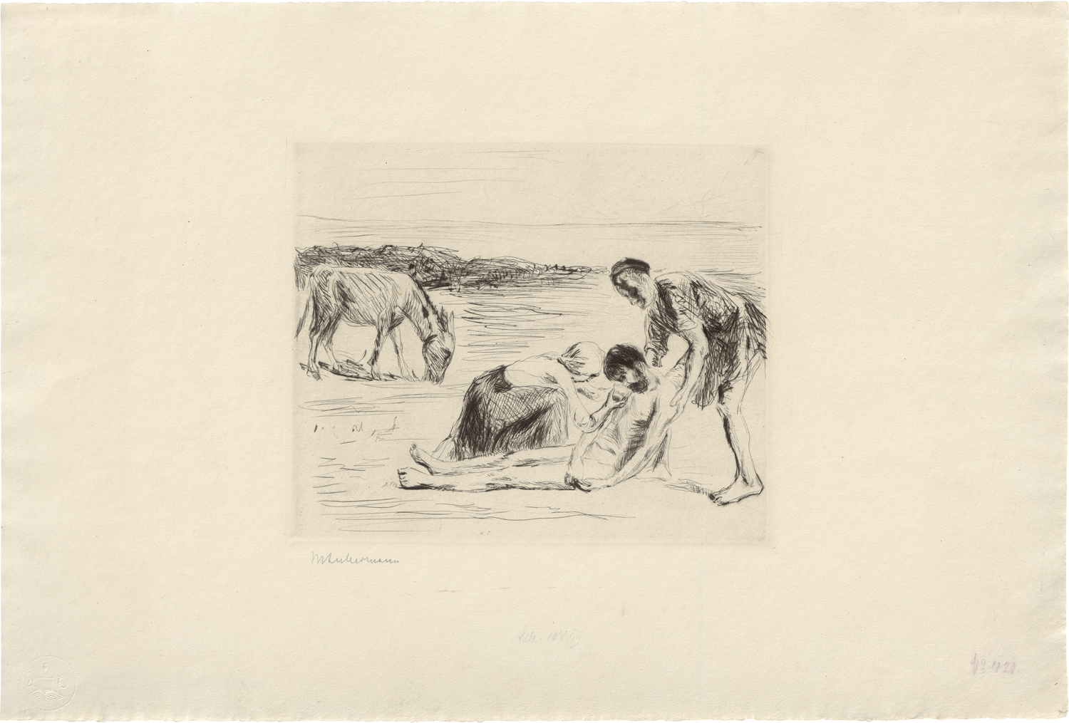Wohl eines der unnumerierten Exemplare neben der finalen Auflage von 30 Exemplaren, erschienen im Verlag Bruno Cassirer Berlin, mit dem Blindstempel unten links. Obwohl das Entstehungsjahr bei Schiefler mit 1910 angegeben ist und eine Abbildung des Motivs 1912 in dem Bruno Cassirer Prospekt "Neue Graphische Arbeiten von Max Liebermann Berlin 1912" erscheint, ist das Wasserzeichen des hier vorliegenden Blattes von JW Zanders auf 1916 datiert. Feiner Druck mit sehr breitem Rand.
