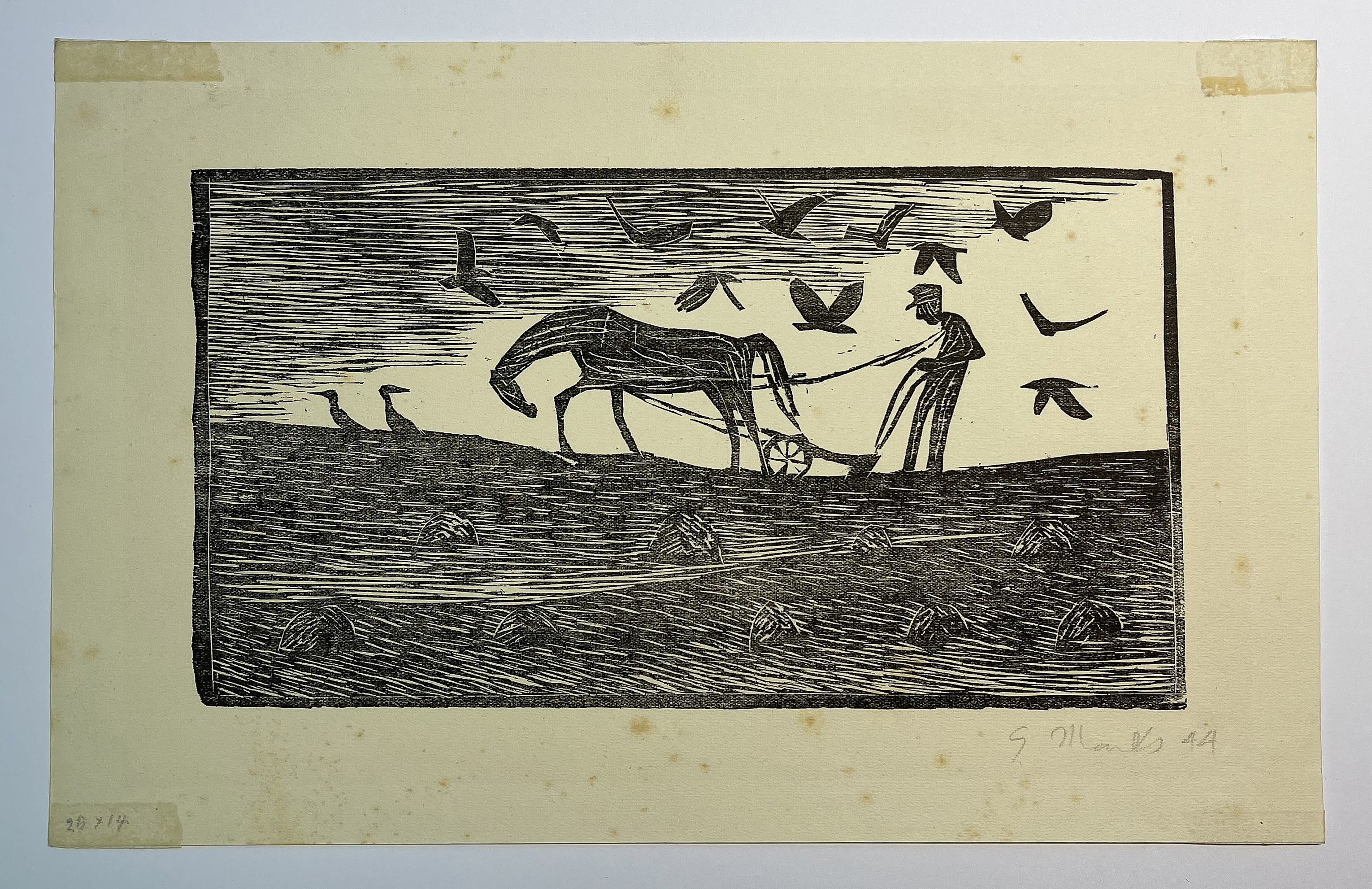 Beide Holzschnitte entstanden im Jahr 1944; vor den kleinen, jeweils erst 1949 gedruckten Auflagen (27 bzw. 21 Exemplare) sind Lammek nur wenige früher entstandene Einzeldrucke bekannt. Marcks datiert die "Kartoffellegerinnen" 1945, den "Pflüger I" 1944. Ganz ausgezeichnete Drucke mit Rand.