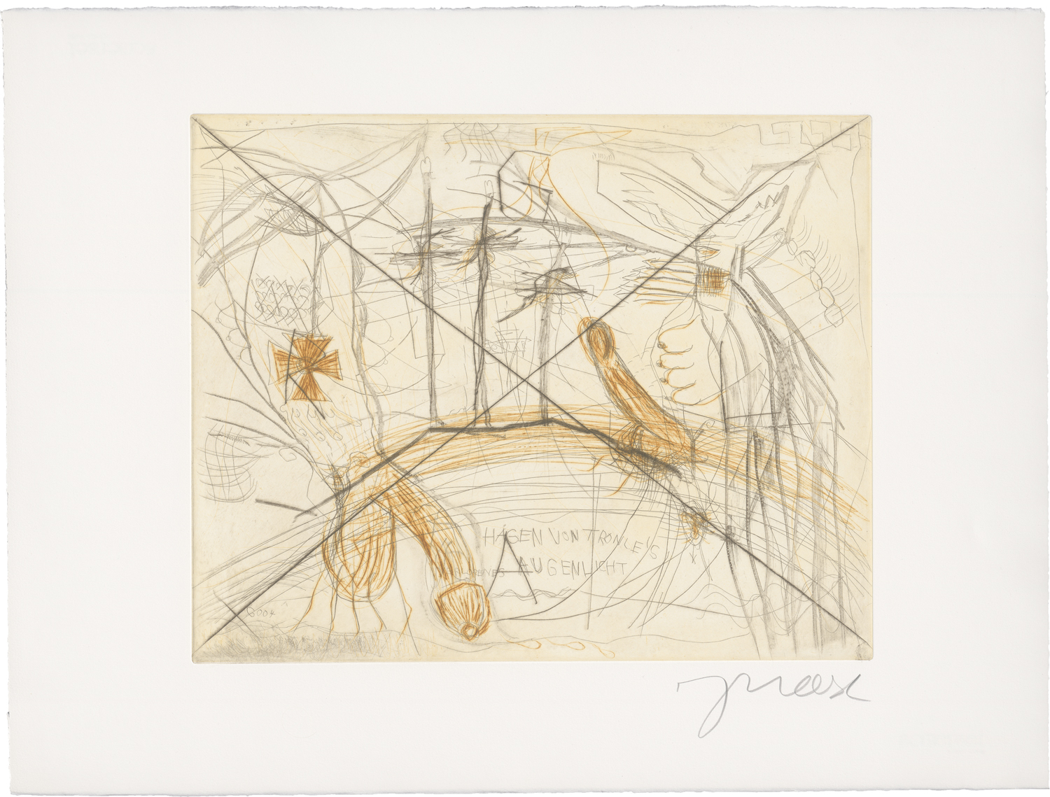Die vollständige Folge, erschienen bei der Griffelkunst-Vereinigung, Hamburg 2007, jeweils verso mit deren Stempel. Die Edition umfasst die Blätter "Zwei Schwänze für ein Halleluja", "Der hohlste Kunsthistoriker", "Die Exe Schrympeley", "Der Junker Toni, Ohni", "Don Skeletti im Fettnapf mit 10 Zäpfchen" und "Colonel Iverson". Prachtvolle, gratige Drucke mit dem vollen Rand.