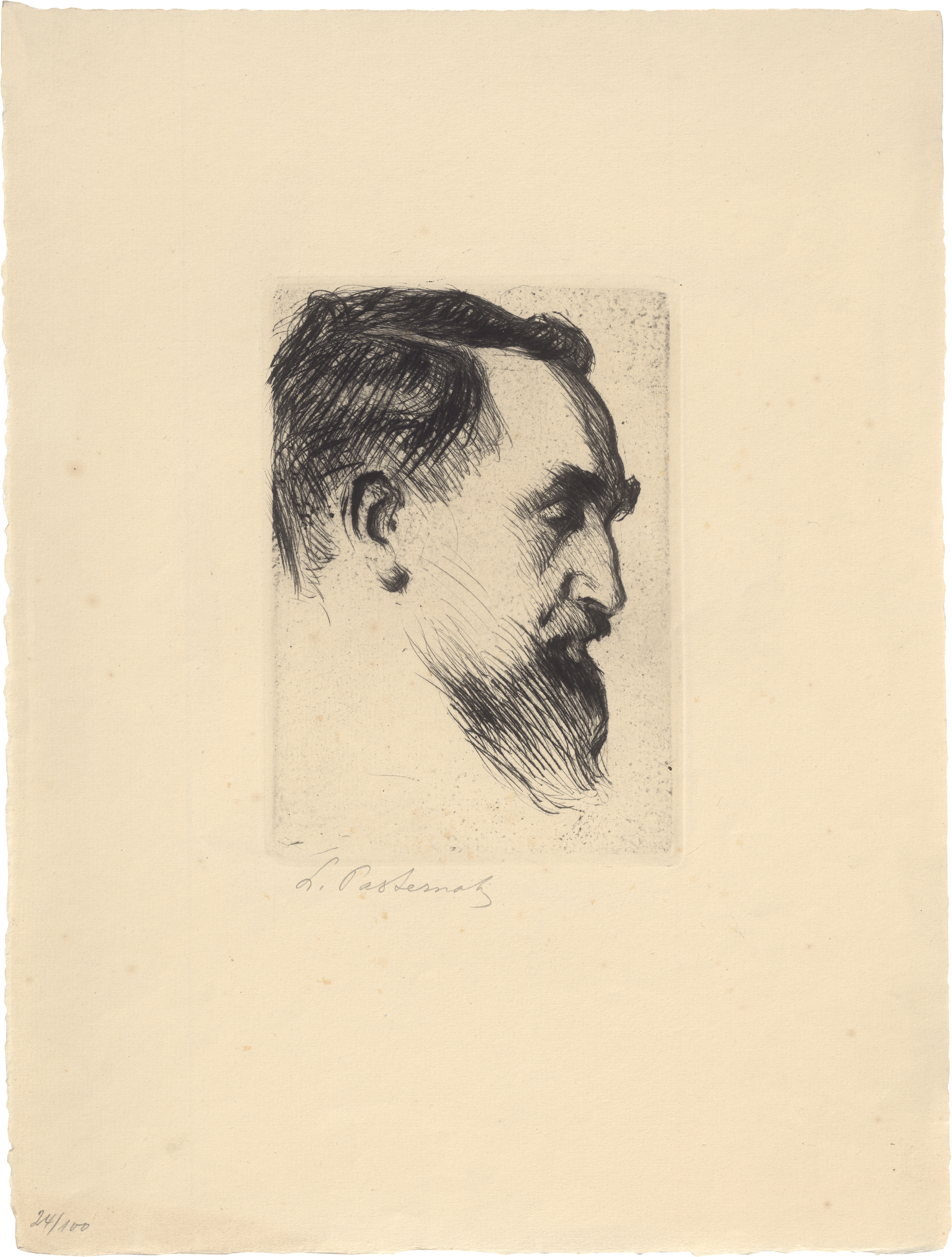 Seltene Graphik des russischen Künstlers Leonid Osipovich Pasternak, in der er seinen Künstlerfreund Hermann Struck portraitiert. Umgekehrt hat auch Struck einige Portraits von Pasternak angefertigt. Pasternak reiste 1921 für eine Augenoperation nach Berlin wo er bis 1938 blieb, bevor er nach England floh. Struck selbst emigrierte 1923 nach Palästina, das Portrait müsste also in diesen zwei überschneidenden Berliner Jahren entstanden sein. Prachtvoller Druck mit subtil glänzendem Plattenton und mit dem vollen Schöpfrand.