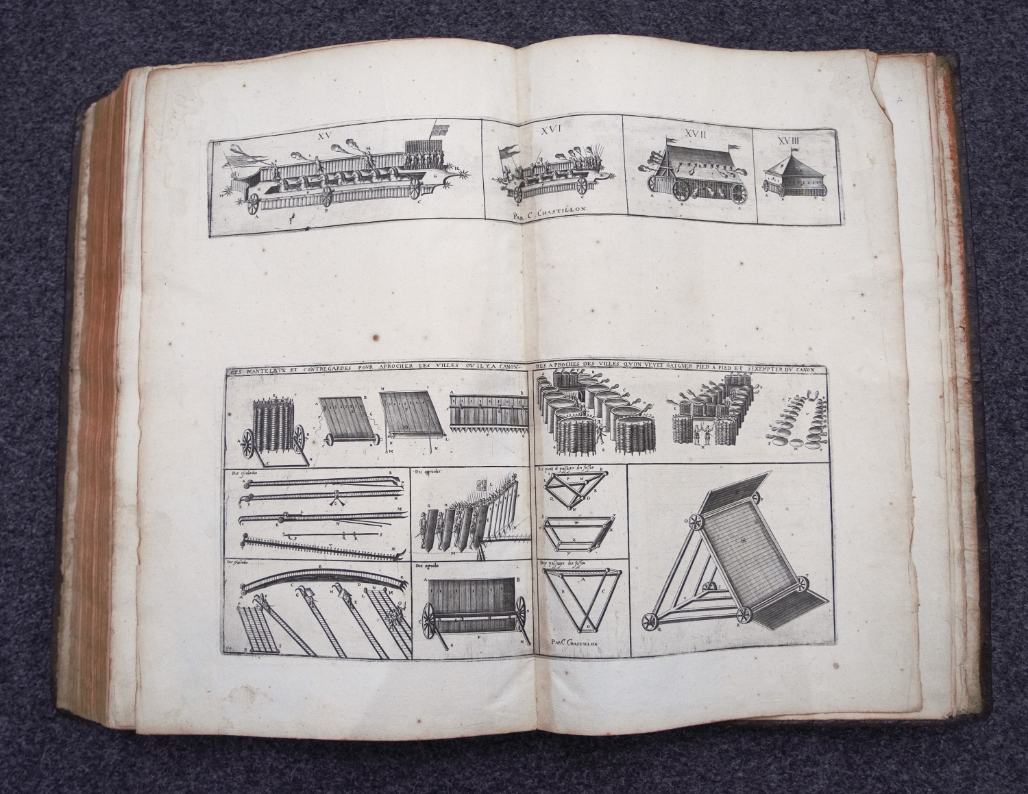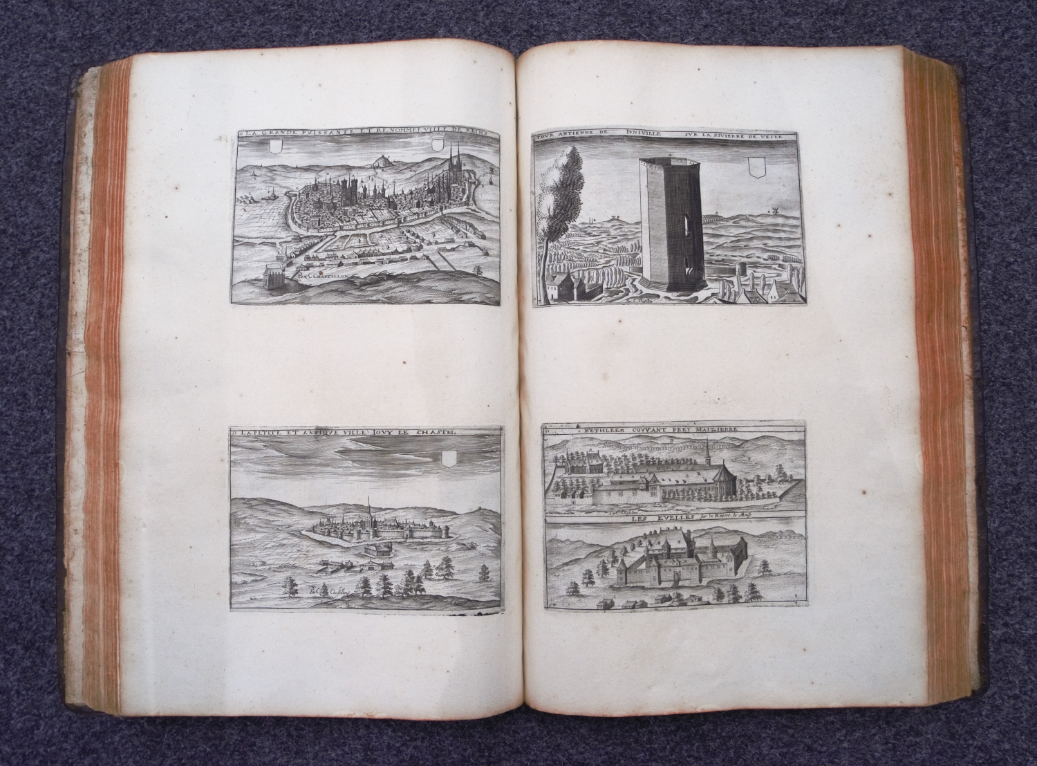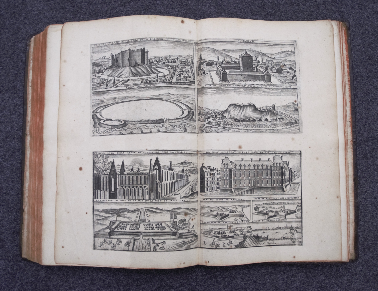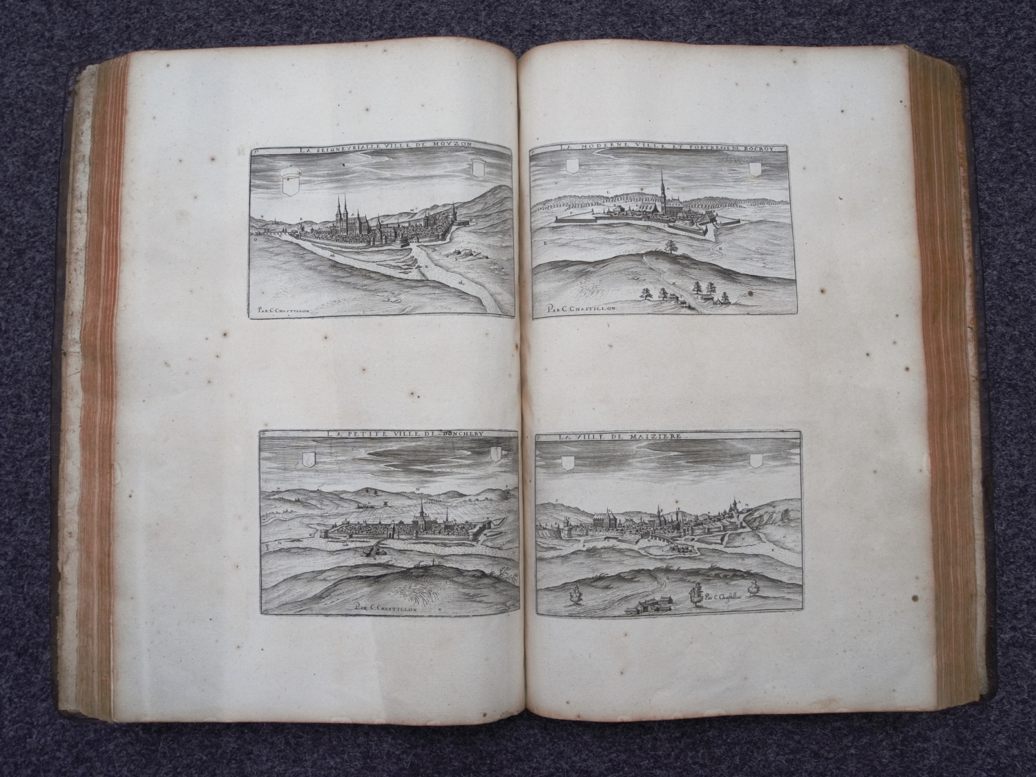 Chastillon, Claude. Topographie françoise ou representations de plusieurs villes, bourgs, chasteaux, maisons de plaisance, ruines & vestiges d'antiquitez du royaume de France. 1 Bl. (Inhalt). Mit Kupfertitel, 157 Tafeln mit je 2 Kupfern, 45 doppelblattgroßen Kupfertafeln und 10 gefalteten Kupfertafeln. 44,5 x 28,5 cm. Leder d. Z. (stärker berieben und mit Schab- oder Kratzspuren, Rücken fachmännisch unter Verwendung alten Bezugsmaterials restauriert) mit RVergoldung und goldgeprägtem RTitel. Paris, Jean Boisseau, 1641.