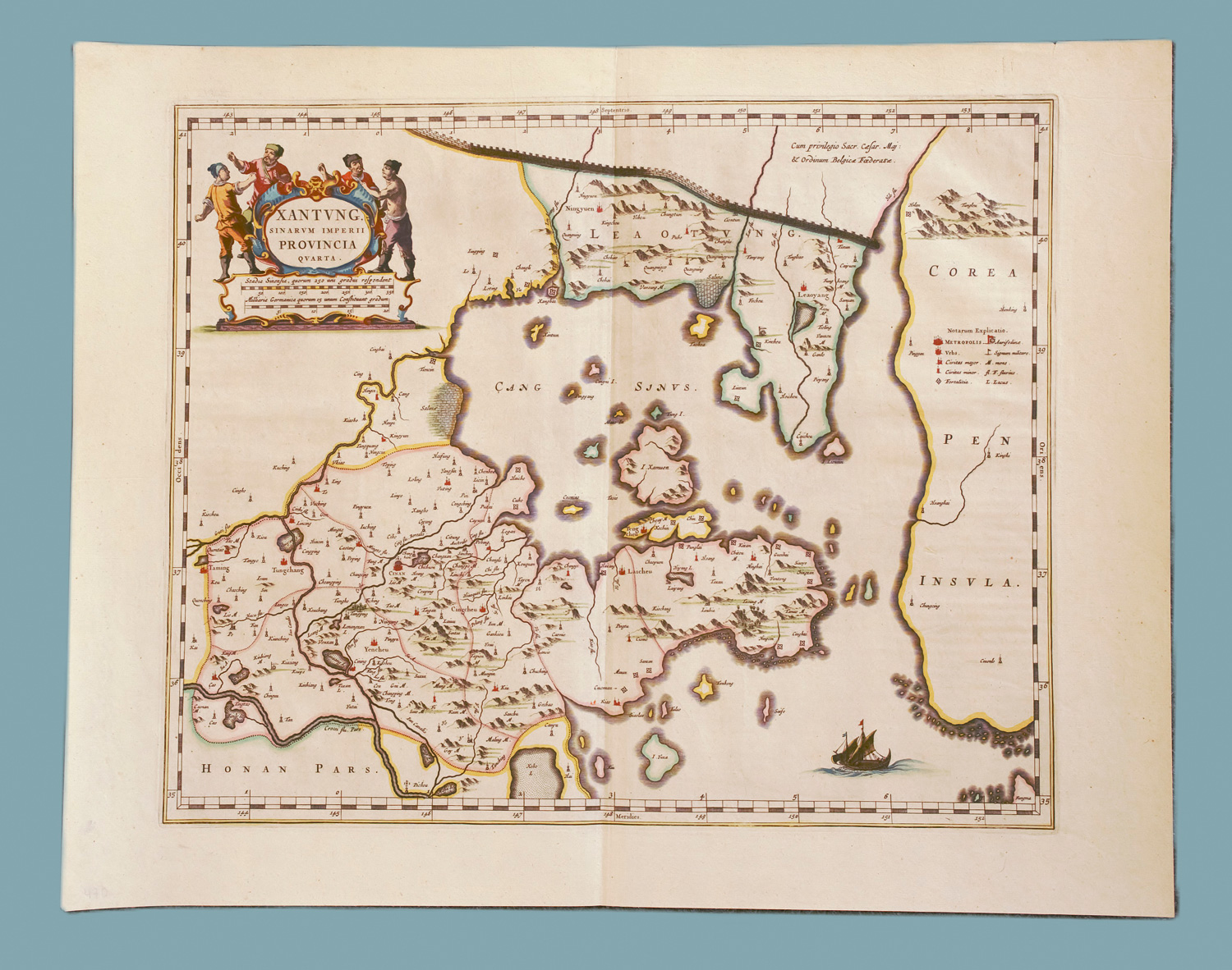 Blaeu, Joan. Xantung, Sinarum Imperii Provincia Quarta. Grenzkolorierte Kupferkarte. 40 x 49 cm (Plattenrand) bzw. 47 x 60 cm (Blatt). 1655.