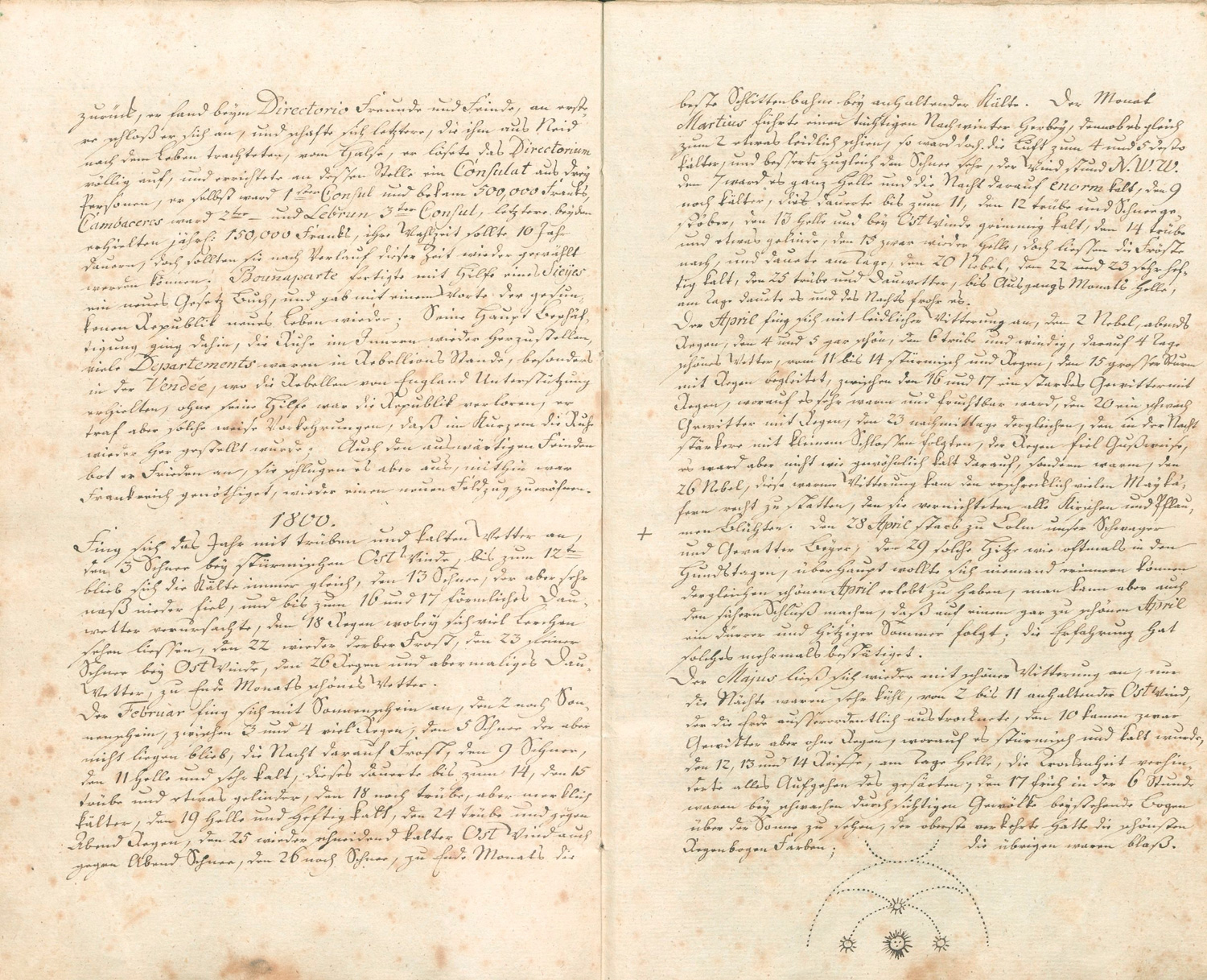 Die ständige Bedrohung durch die napoleonischen Truppen wird ebenfalls ausfühlich für den Landstrich protokolliert. So heißt es "Anno 1813 [...] den 4 [April] sehr kühl, an diesem Tage rückten in Mutzschen und umliegender Gegend viel Russische Cavallerie ein, aus dem hiesigen Magazin holten sie Hafen und Heu, in Reckwitz hatte jeder Bauer [Dienst?], den 5 hatten sie Rasttag, und gingen den 6 mit 12 Stücken Geschütz hier durch Wermsdorf nach Luppa zu, die Pferde waren schön, nicht so ihre Aufführung, den ganzen Tag heftiger Wind, den 9 ein wahrer Sommertag, abends querelten die Frösche [...]". Die kleine Randzeichnung mit einer ekliptischen Wetterskizze, die einen Regenbogen darstellt. – Vollständig, Bindung teils gelockert oder Lagen etwas ausgebunden, vereinzelte kleine Gebrauchsspuren und Braunfleckchen, teils etwas gebräunt, insgesamt sehr saubere, bemerkenswert gut lesbare Handschrift. Beiliegt ein weitere Blatt "Witterungsbeobachtung" von 1841.
