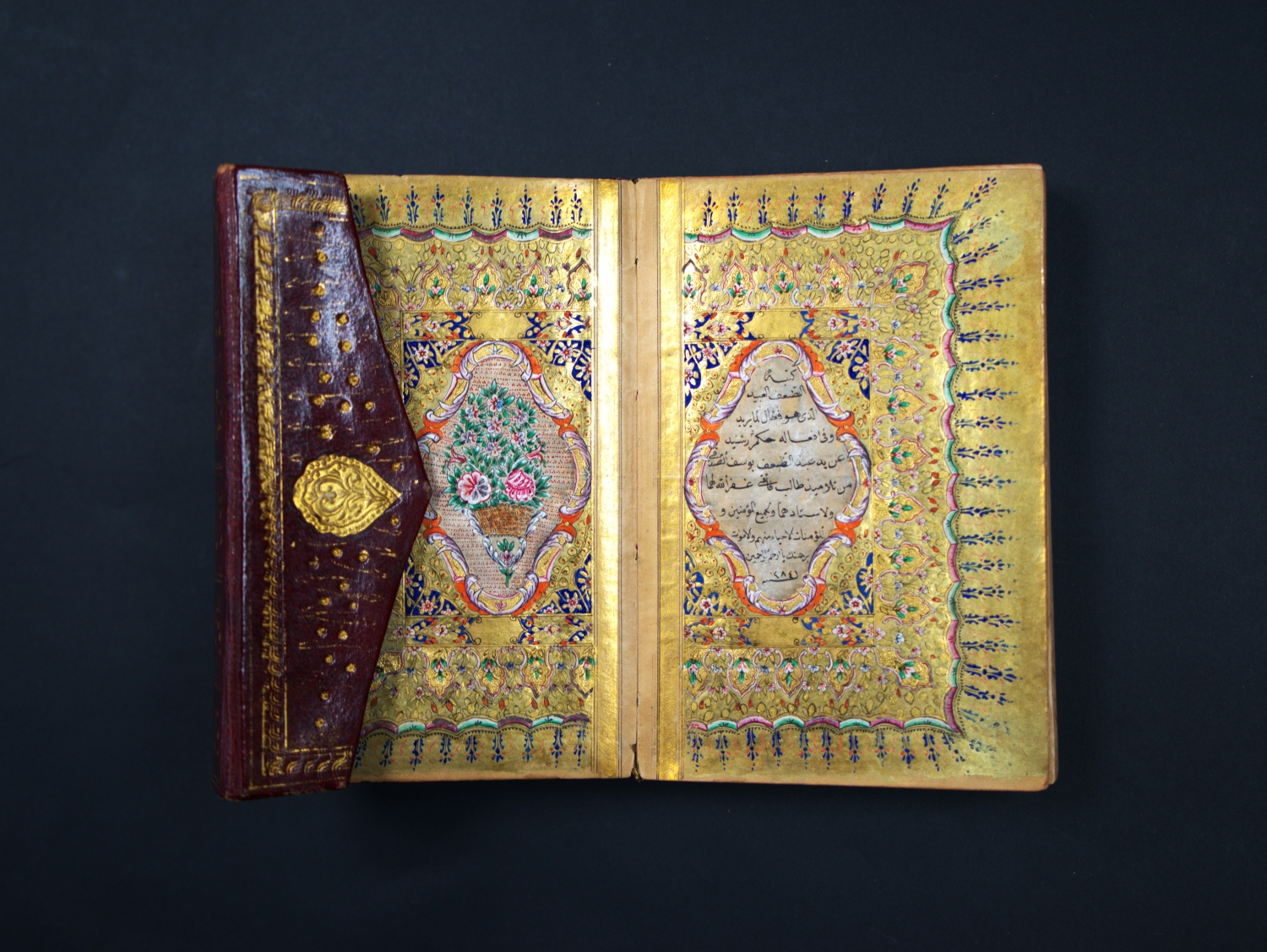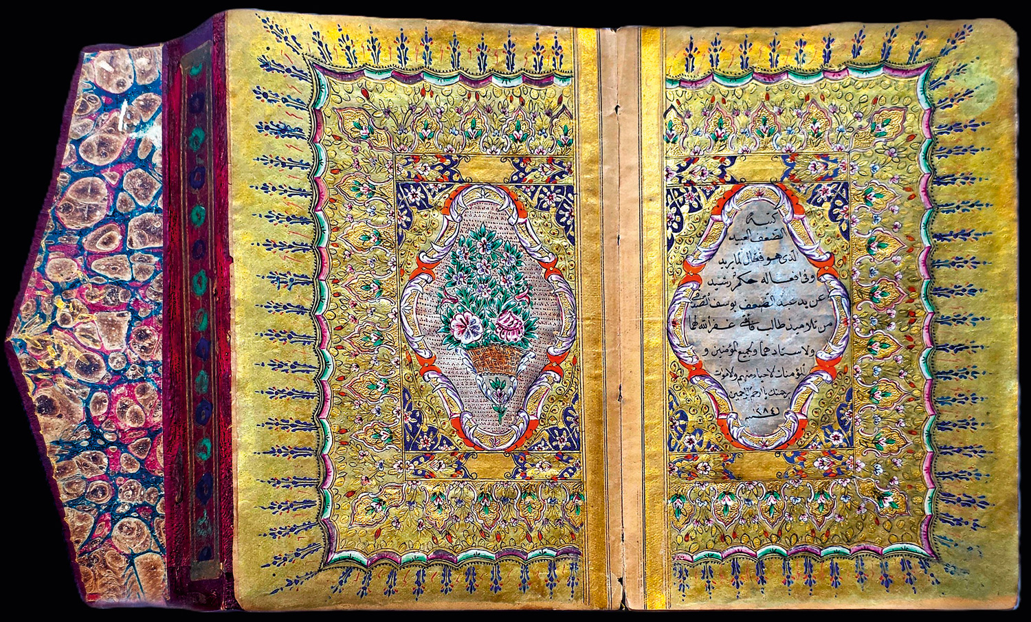 Überaus reich geschmückter Goldkoran in seinem originalen, ebenfalls reich verzierten Klappenband mit drei goldüberzogenen, Doppelzierseiten mit Ornamenten in teils punziertem Gold und Farben, in Indigoblau, in Karmesinrot, in Grün, in Orange und Violett, teils mit Weißhöhungen und -verläufen, datiert auf das Jahr "1284" Anno Hegirae, nach der Hidschra. Die Handschrift beginn mit einer besonders feinen, auf flächigem Goldgrund mit reicher Farbigkeit und Ornamentik geschmückten Doppelzierseite (Serlevha), auf der in feinster schwarzer Miniaturschrift im Nastaliq-Duktus die erste Sure (al-Fatiha) und der Anfang der zweiten Sure (al-Baqara) in je einer Kartusche stehen, die mit zahlreichen bunten Blumen umgeben sind. Um den mit viel blau und roten Palmetten verzierten Kasten ist eine breite Bordüre mit zehn Schildern gelegt, die wiederum mit entzückenden bunten Blumen bemalt sind. Blaue und rote Zinnen strahlen radial von der Bordüre aus.