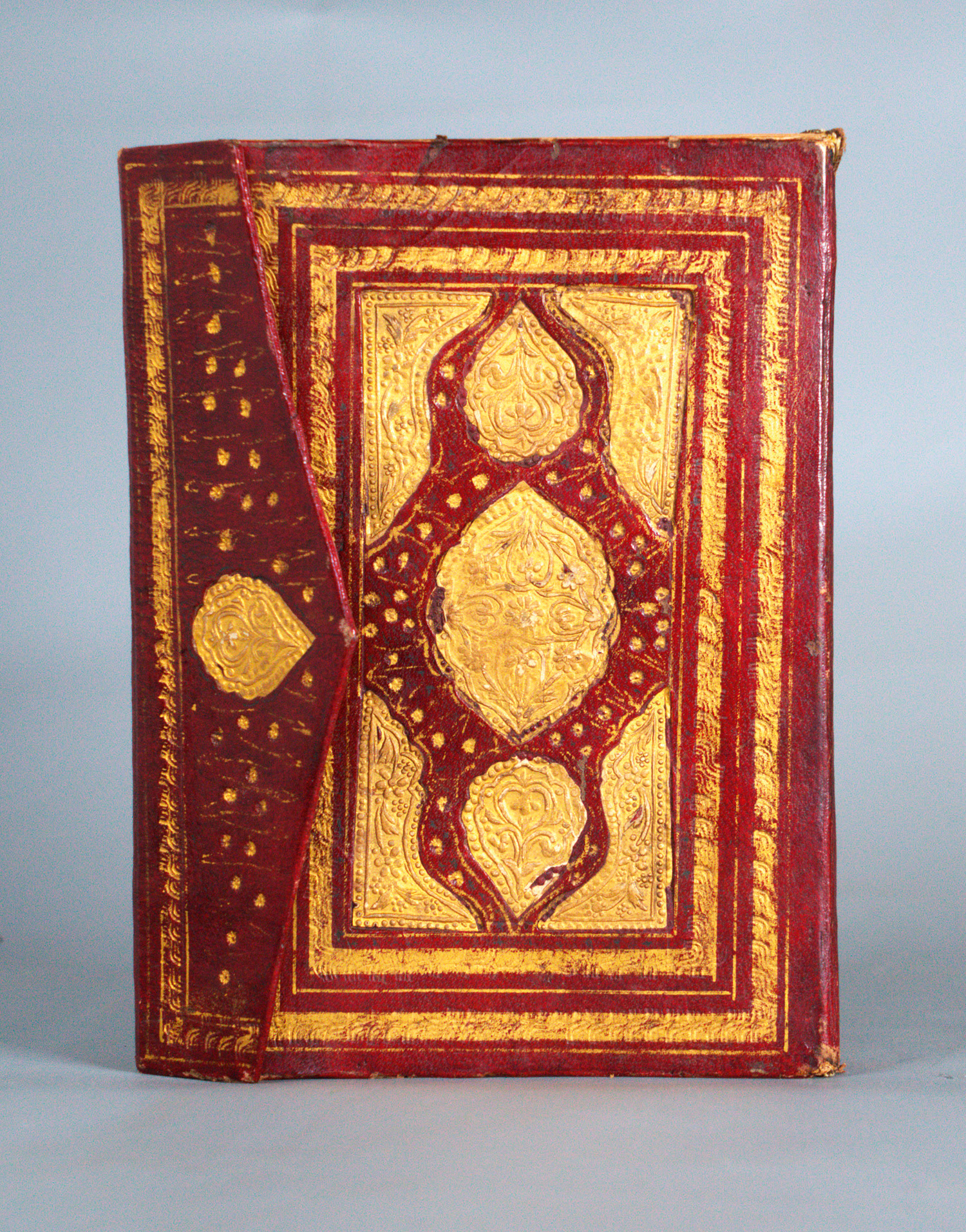 Die aufwendige Goldprägung des Einbandes folgt dem traditionellen Muster mit zwei Riefelbordüren (Zencirek) in Goldfiletenrahmen, zentraler, leicht mandelförmiger "Sonne" (Shemse), den Sonnenanhängern (Salbek) und den vier geschwungenen, reich mit floralen Binnenmustern gefüllten Eckstücken (Köshebent). Die Klappe (Mikleb) schützt die mit bunten und goldenen Blumen geschmückte Schnittkante, sie ist mit einer weiteren Shemse geschmückt. Die Innenklappe und Deckel sind mit buntem Marmorpapier ausgestattet, die Schnittschutzklappe mit bunten Blumen bemalt.