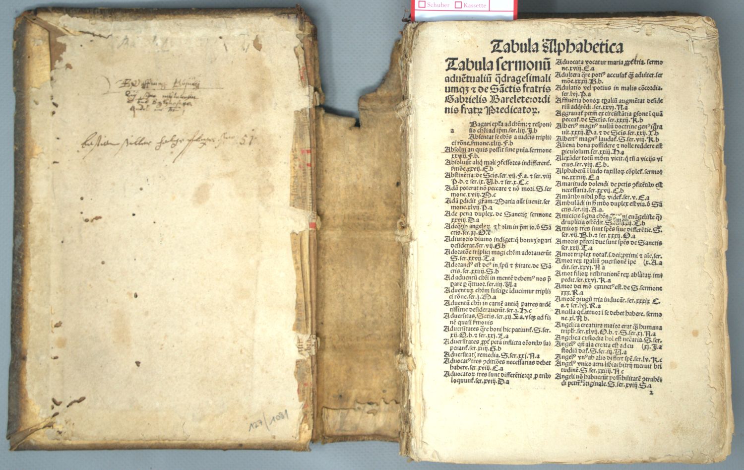 VD16 G 8. – Frühe Ausgabe der im 16. Jahrhundert weit verbreiteten Fastenpredigten des berühmten italienischen Geistlichen Gabriele da Barletta (gest. nach 1480). – Die ersten beiden Textblatt ("Registrum Sermonum" und "Animadverte diligens") fehlen. Teils stärker mit Randläsuren, feuchtrandig, mit hs. Notizen im Text. Sehr selten.