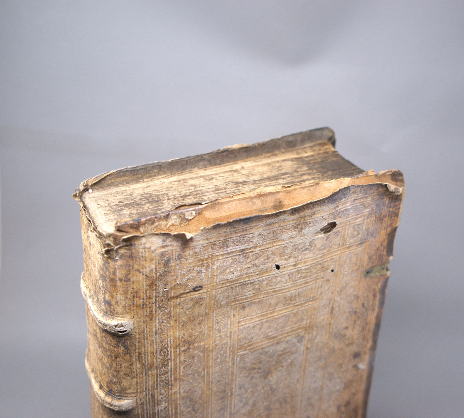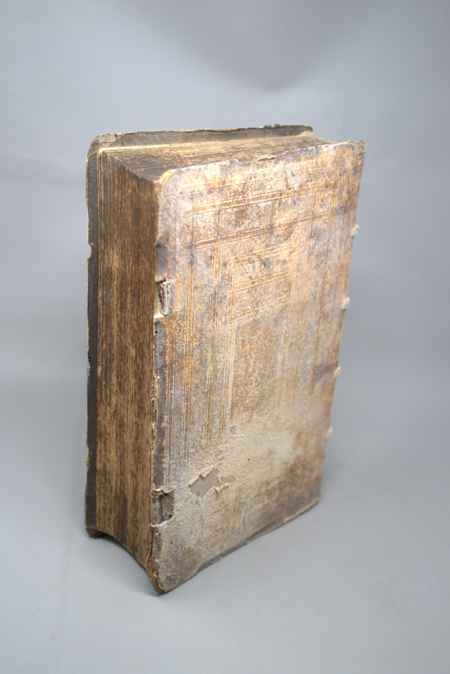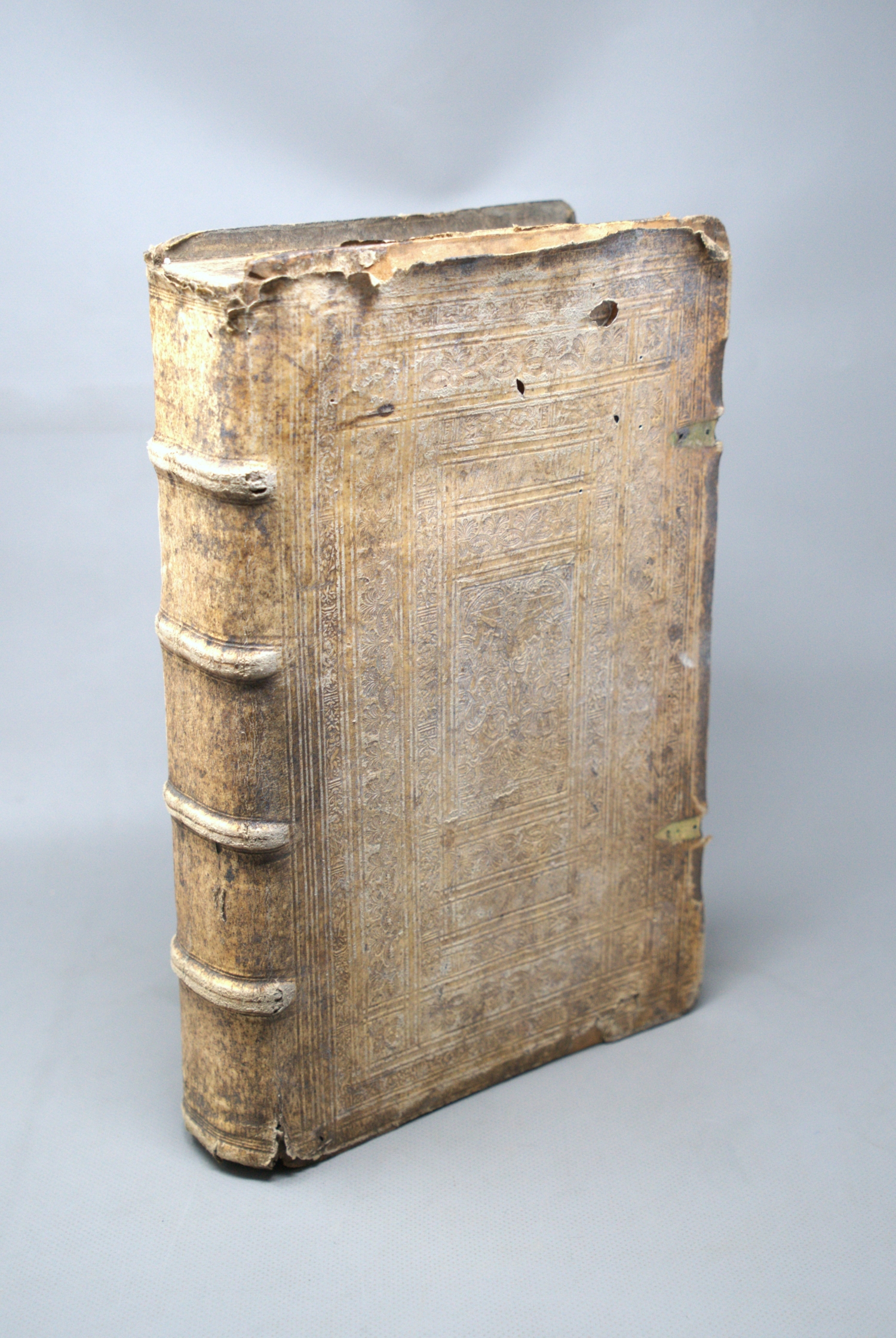 Concordia. Christliche, widerholete, einmütige Bekentnüs nachbenanter Churfürsten, Fürsten und Stende Augspurgischer Confession, und derselben zu Ende des Buchs underschriebener Theologen Lere und Glaubens. Mit angeheffter wolgegründter Erklerung etlicher Artickel, bey welchen nach D. M. Luthers seligen Absterben, Disputation und Streit vorgefallen. 2 Teile in 1 Band. 12 nn., 330 num., 1 w., 30 nn. Bl.; XXIIII num. Bl. Titel in Rot und Schwarz. 31 x 19,5 cm. Blindgeprägter Schweinslederband d. Z. (stärkere Gebrauchsspuren, Bezug stellenweise gelöst und mit Kalkweiß überstrichen; ohne die Schließen). Dresden, Matthes Stöckel d. Ä. und Gimel Berg d. Ä., 1579-1580.