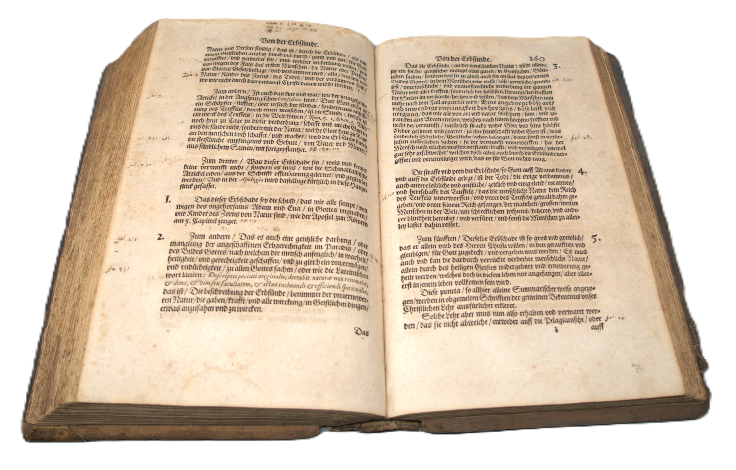 VD16 ZV 29399. – Eine von mehreren im VD 16 verzeichneten Druckvarianten der Konkordienformel, die 1579 bis 1580 bei Stöckel und Berg gedruckt wurden. Am Schluss u. a. "irrige Artickel" der Widertäufer, Schwenckfeldianer und neuen Arrianer sowie 23 Blatt mit dreispaltigen Namenslisten der Unterzeichner, geographisch geordnet. "Um die endlosen Streitigkeiten der lutherischen Theologen beizulegen, veranlasste Kurfürst August von Sachsen mit Vorwissen der vornehmsten protestantischen Fürsten 1576 zu Torgau einen Theologenkonvent, auf dem Andreä, Chemnitz, Chyträus, Musculus, Selnecker und andere eine Einigungsformel aufsetzten, das sogenannte Torgische Buch. Da gegen dieses Buch von verschiedenen Seiten Einspruch erhoben wurde, ließ es Kurfürst August durch die vorgenannten Theologen 1577 im Kloster Bergen bei Magdeburg revidieren. So entstand das Bergische Buch, auch Konkordienformel genannt, welches 1580 zu Dresden veröffentlicht wurde" (LThK II, 116). – Titel mit altem Tintennotat. Etwas gebräunt und braunfleckig, anfangs und am Schluss auch mit Feuchtigkeitsrändern.