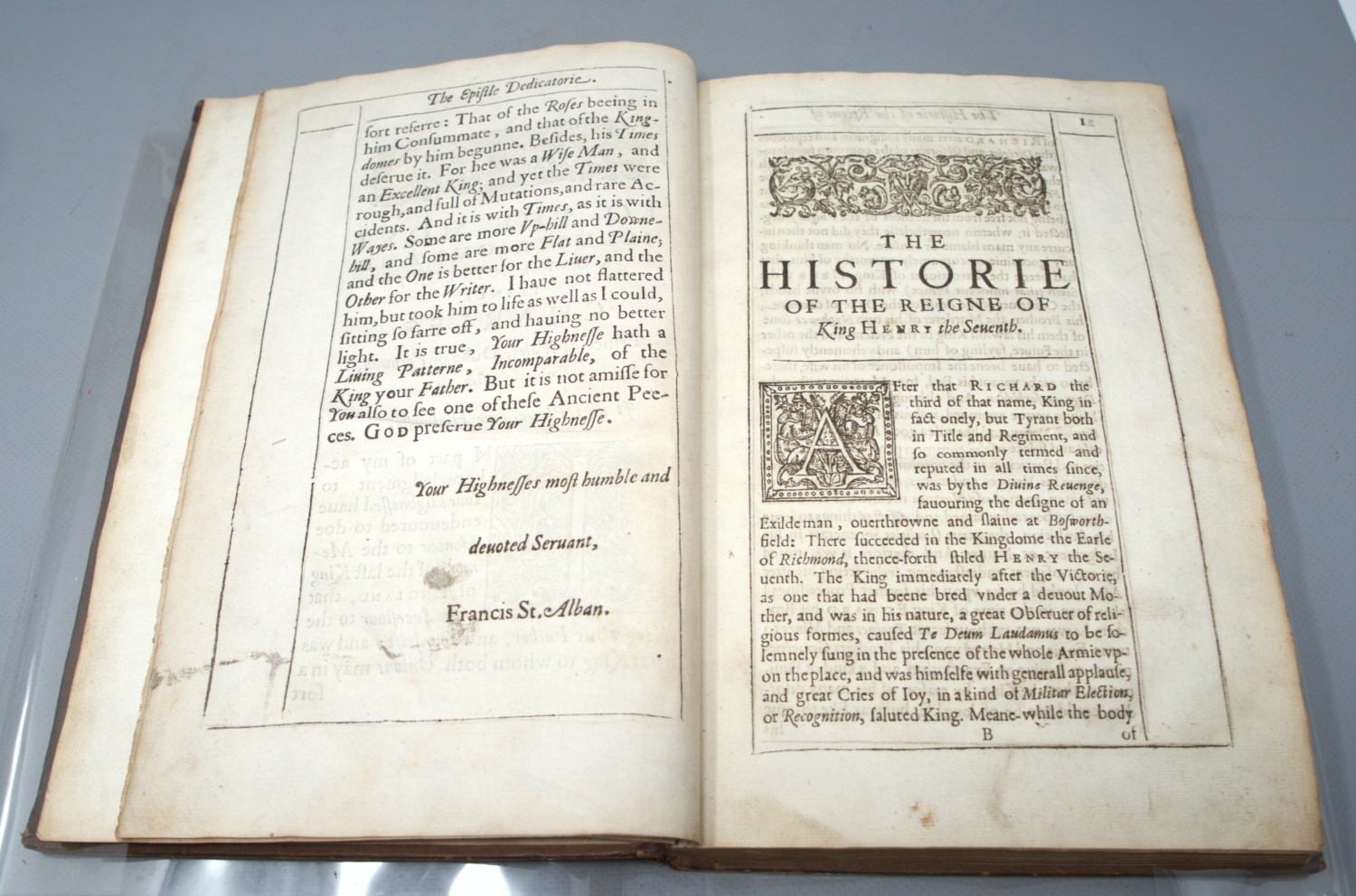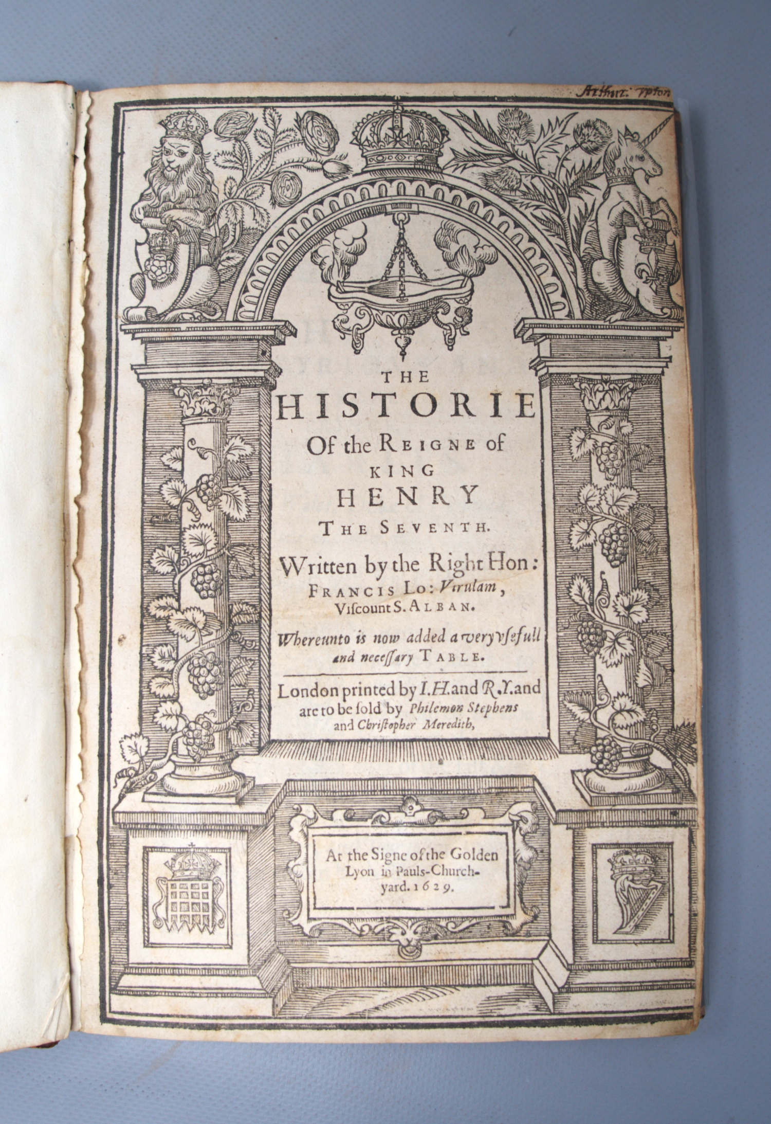 Lowndes I, 95. STC 1161. – Nachdruck der erstmals 1622 erschienenen Ausgabe dieser Geschichte der Regentschaft Henrys VII. (1457-1509), des Begründers der Tudor-Dynastie – Mit gestoch. Exlibris ("Middle Aston"); ohne das gestoch. Porträt Henrys VII.; teils gebräunt und minimal fleckig.