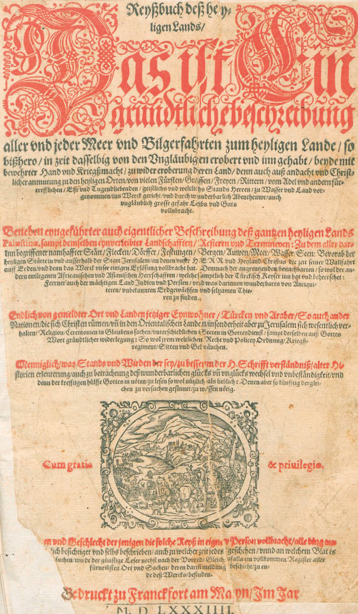 (Feyerabend, Sigmund). Reyßbuch dess heyligen Lands, das ist, ein grundtliche beschreibung aller und jeder Meer und Bilgerfahrten zum heyligen Lande... Beneben eyngeführter auch eigentlicher Beschreibung dess gantzen heyligen Lands Palaestinae... Endlich von gemeldter Ort und Landen jetziger Eynwohner, Türcken und Araber... 6 Bl., 466 num. Bl, 4 (von 6) Bl. Mit Holzschnitt-Vignette auf dem Titel, 2 halbseitigen Holzschnitten. Titel in Schwarz und Rot. 31 x 20 cm. Leder d. Z. (beschabt, bestoßen, mit Fehlstellen sowie ohne die Schließen) über Holzdeckeln. Frankfurt, S. Feyerabend, 1584.