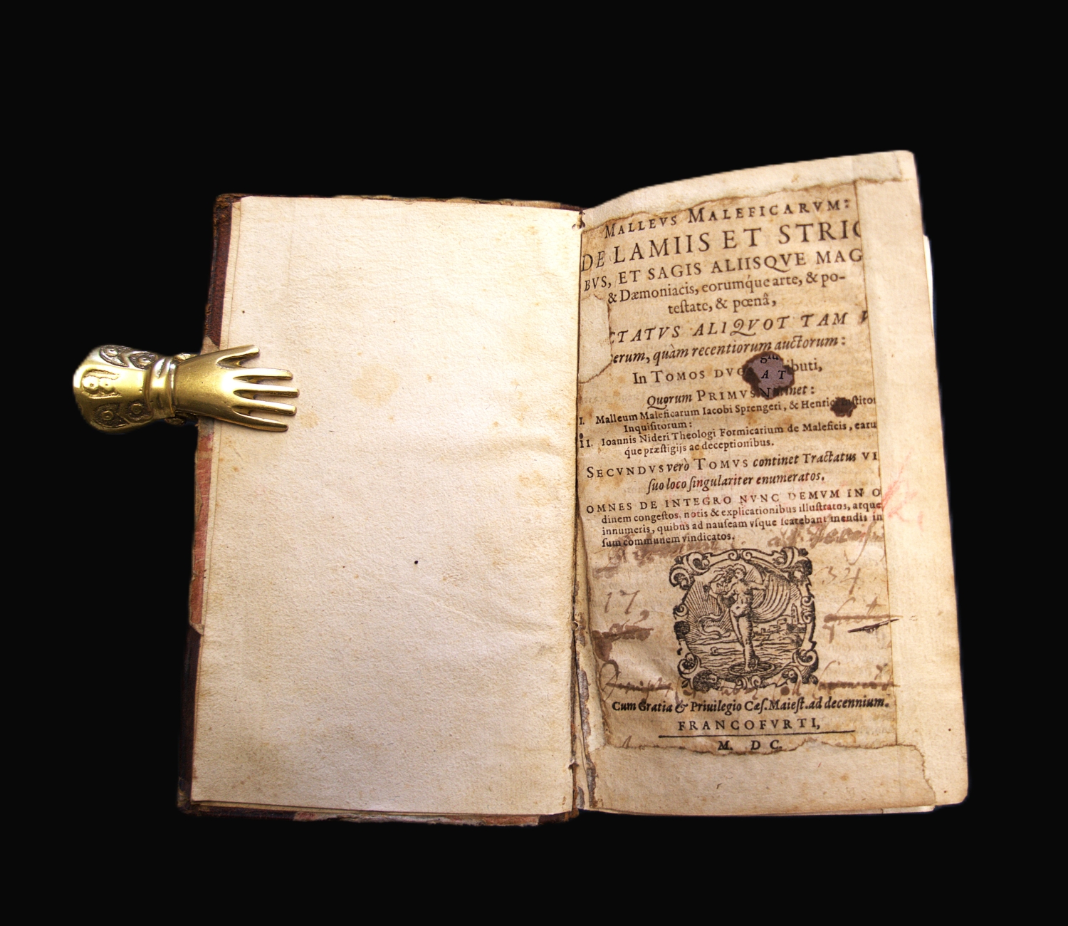 Die Autorschaft seines Mitbruders Jakob Sprenger, die auch im vorliegenden Exemplar, das von dem Servitenmönch Raffael Maffei herausgegeben und überarbeitet wurde, erhalten blieb, ist nach heutigem Forschungsstand hingegen umstritten und wird als Verleumdung beschrieben, da Sprenger sich als Gegner der Hexenverfolgung bekannte (Vgl. Tschacher, Lexikon zur Geschichte der Hexenverfolgung). – Nur der erste Band vorhanden. Knapp beschnitten, Titel mit Fehlstelle (Text etwas betroffen), ersten sechzehn Blätter mit größerer bis kleinerer hinterlegten Fehlstelle am Außensteg, die letzten fünfundzwanzig Seiten mit Feuchtrand sowie durchgehend etwas stockfleckig.
