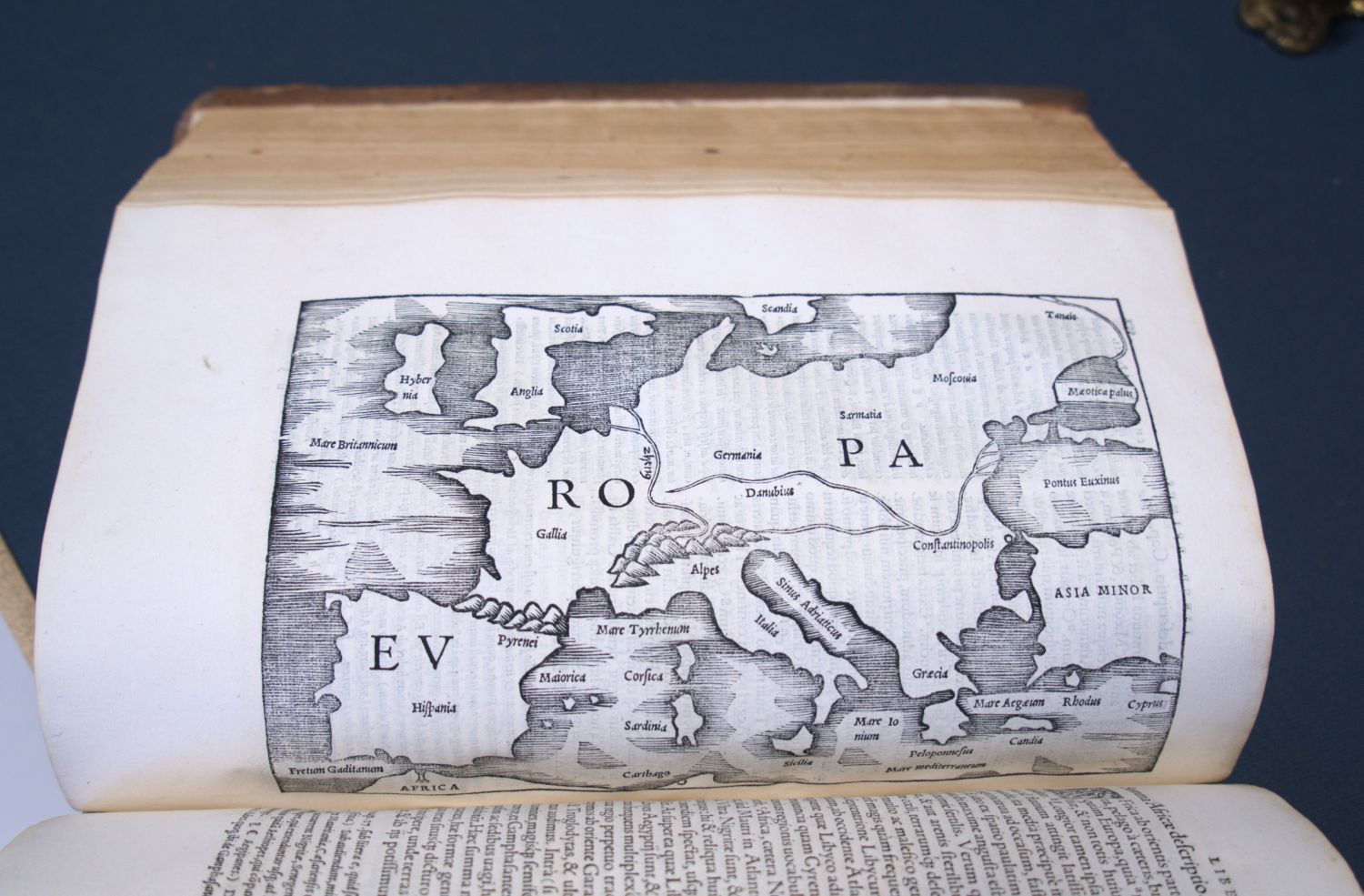 Besonders bemerkenswert ist die hübsche Holzschnittkarte, die den Mittelmeerraum mit zwei Schiffsstaffagen zeigt. – Mit Exlibris auf dem Vorsatz. Erster Titel mit hs. Besitzvermerken und etwas gebräunt. Insgesamt mit Wurmlöchern, knickspurig und vereinzelt leicht fleckig.
