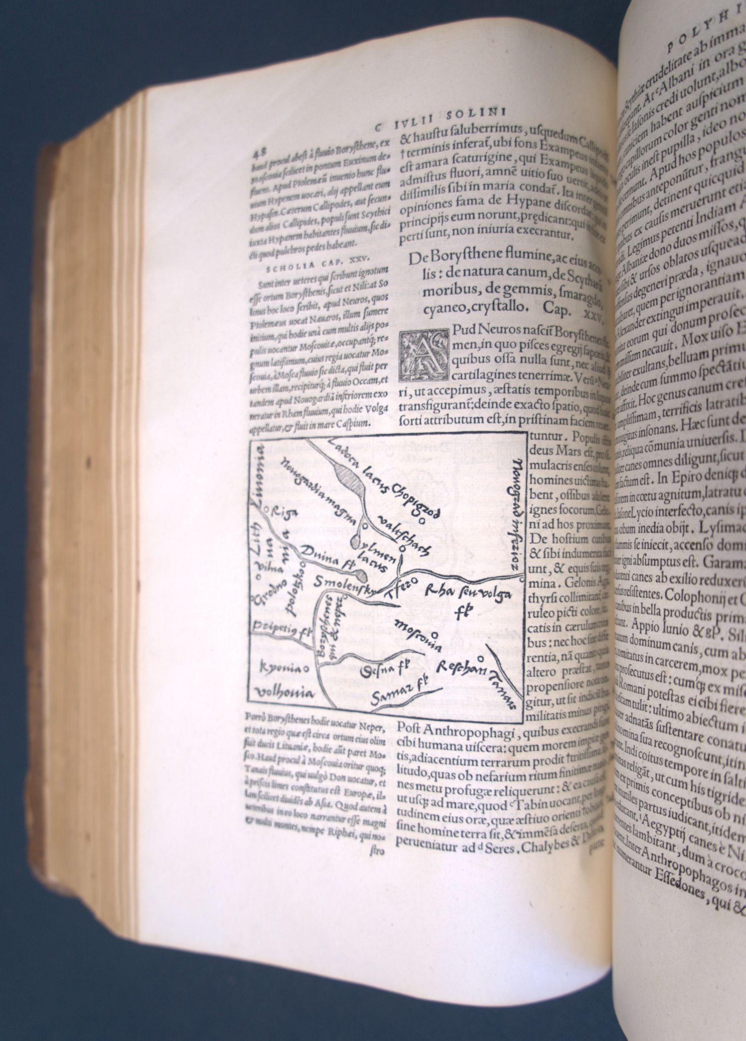 Sammelband. 5 Schriften von zum Beispiel Herodot, Thukydides oder Gaius Julius Solinus. 31 x 19,5 cm. Holzdeckel (mit Wurmlöchern, Fehlstellen, RDeckel fehlt sowie ohne die Schließen) mit blindgeprägtem Schweinsleder Rücken (berieben und mit Wurmlöchern). Verschiedene Orte und Verlage 1527-1538.