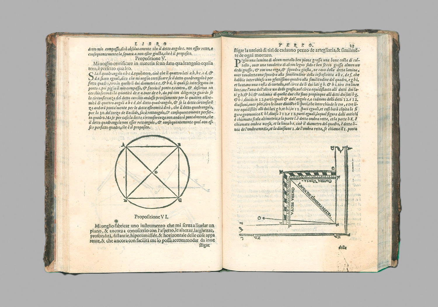 Das Titelblatt zeigt einen großformatigen Holzschnitt mit dem Wappen Francesco Maria II. della Roveres, Herzog von Urbino. Darunter eine beinahe ganzseitige allegorische Darstellung, in der Tartaglia im Zentrum verschiedener - weiblich personifizierter - Wissenschaftsdisziplinen erscheint, umgeben von Autoritäten der Antike wie Euklid, Aristoteles und Platon. – Innenspiegel mit zwei montierten Bibliotheksschildern (eines fast entfernt). Stockfleckig und papierbedingt gebräunt.
