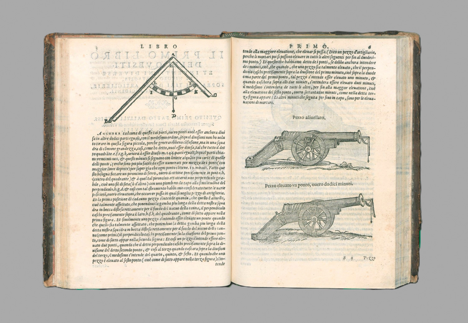 Nicht im KVK. Vgl. Poggendorff 1069 (Erstausgabe von 1537). – Reich illustrierte Ausgabe von Tartaglias (1499-1557) grundlegender Schrift "Nova Scientia", deren Erstdruck 1537 erschien. Es gilt als die erste veröffentlichte Abhandlung zur Ballistik überhaupt und ist somit ein Meilenstein der Bewegungslehre, die später zu den Erkenntnissen Galileis und anderer Wegbereiter führte.