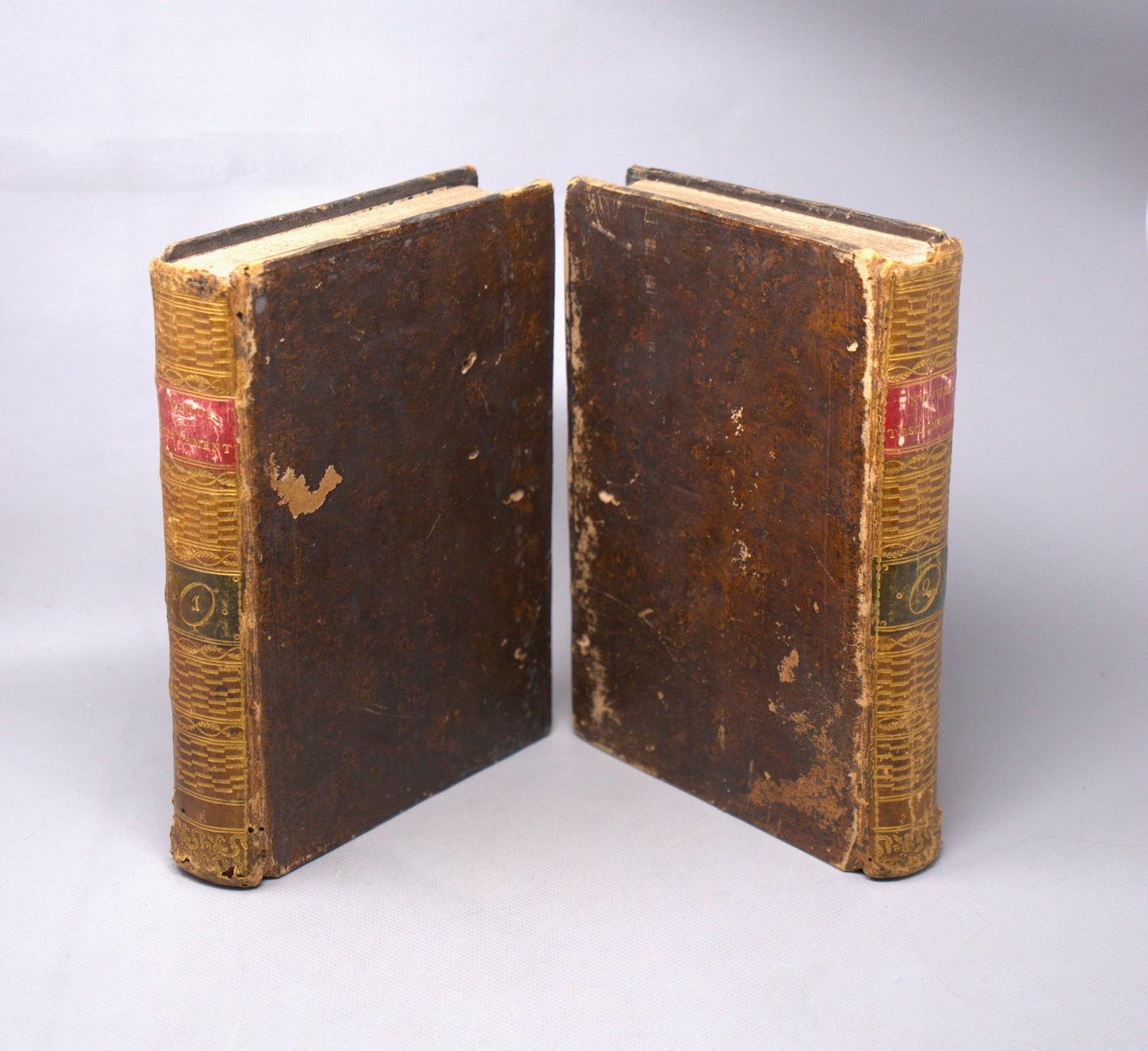 Bilderbibel. Das alte Testament des ewigen Gottes unsers Schöpfers in 91 Kupferbildern vorgestelle. (Und:) Das neue Testament Jesu des Gesalbten unsers Erlösers in 90 Kupferbildern vorgestellet. 2 Bände. 2 Bl. Mit zusammen 181 Kupfertafeln. 23,5 x 17 cm. Lederbände d. Z. (stärker berieben und beschabt sowie mit Wurmspuren) mit goldgeprägten RSchildern und RVergoldung. Wien, J. Adam, um 1810.