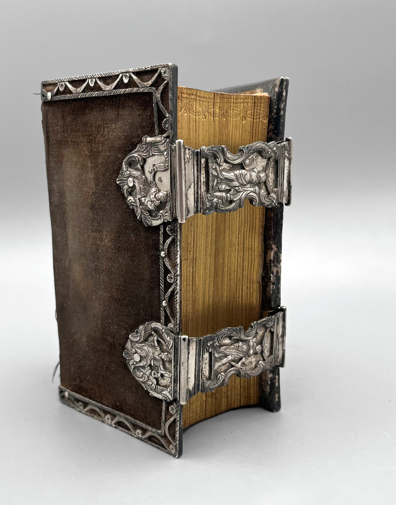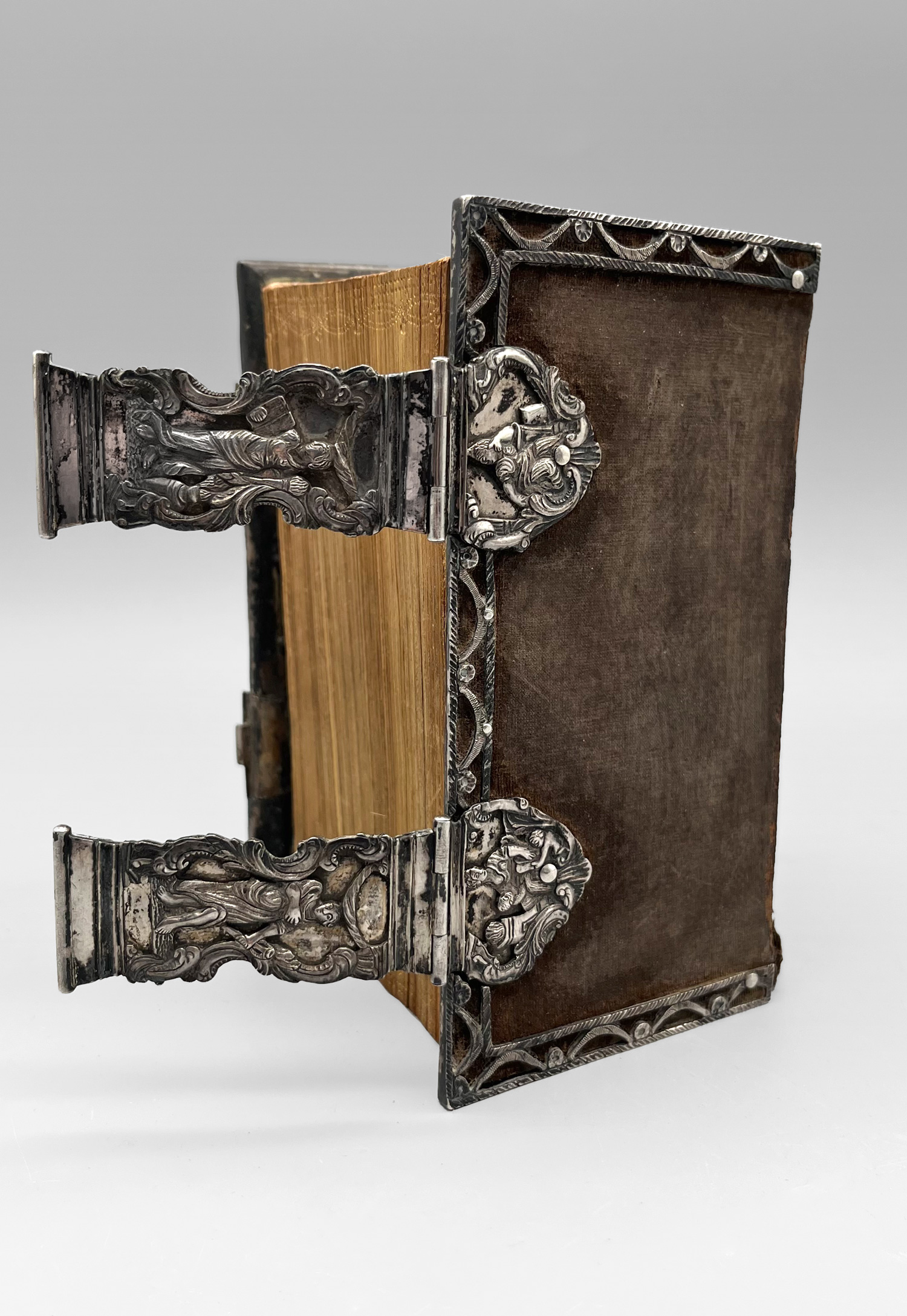 Einbände. - Silberbeschlagband. Holzdeckeleinband mit dunkelbraunem Samtbezug und 2 dreiseitigen, vielfach durchbrochenen punzierten Kantenbeschlägen sowie 2 dreiteiligen Schließbeschlägen, alles aus massiven Silber getrieben, punzierter dreiseitiger Goldschnitt. 15,5 x 9 cm. Niederlande um 1824.