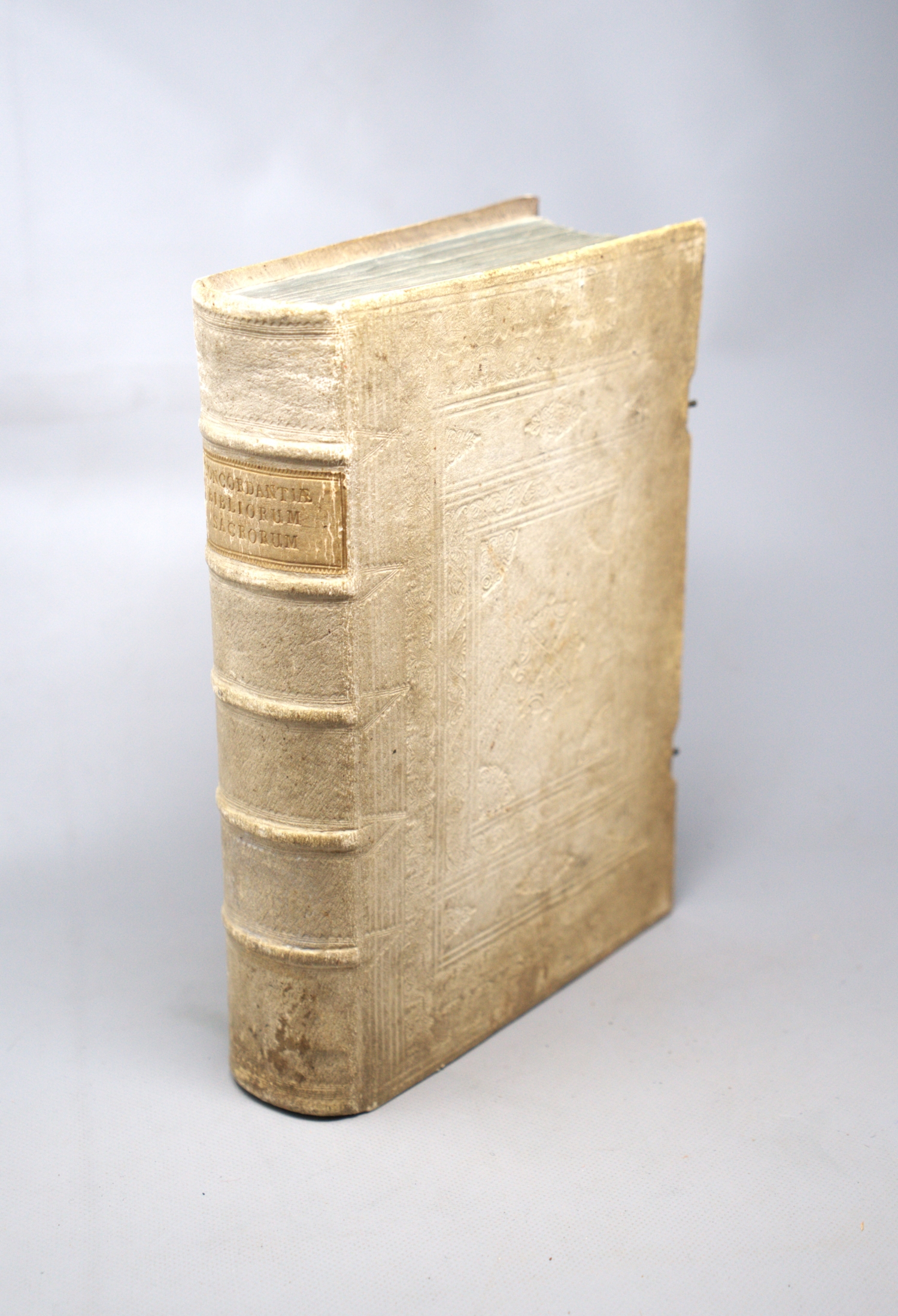Dreispaltig gedruckte Konkordanz, die auf Hugo de Sancto Caro zurückgeht. "Lucas Franciscus (Britgensis), one or the ablest of the Roman Catholic commentators, was born at Bruges in 1549 ... He also produced a Concordance of the Pidgate, corrected and augmented by Herbert Phalesius and Benedict of Afflighem, Antw. 1606" (Best Edition, Antwerpen 1642). – Vereinzelt etwas stock- und fingerfleckig. Titel mit Bibliotheksstempel "Bibliothek des erzb. Klerikalseminars Freising. Duplum D. d. F." und Vorsatz mit hs. Besitzvermerk "Dr. Gerhard Eis Erworben 21. Januar 1948", mit montiertem Besitzschild.