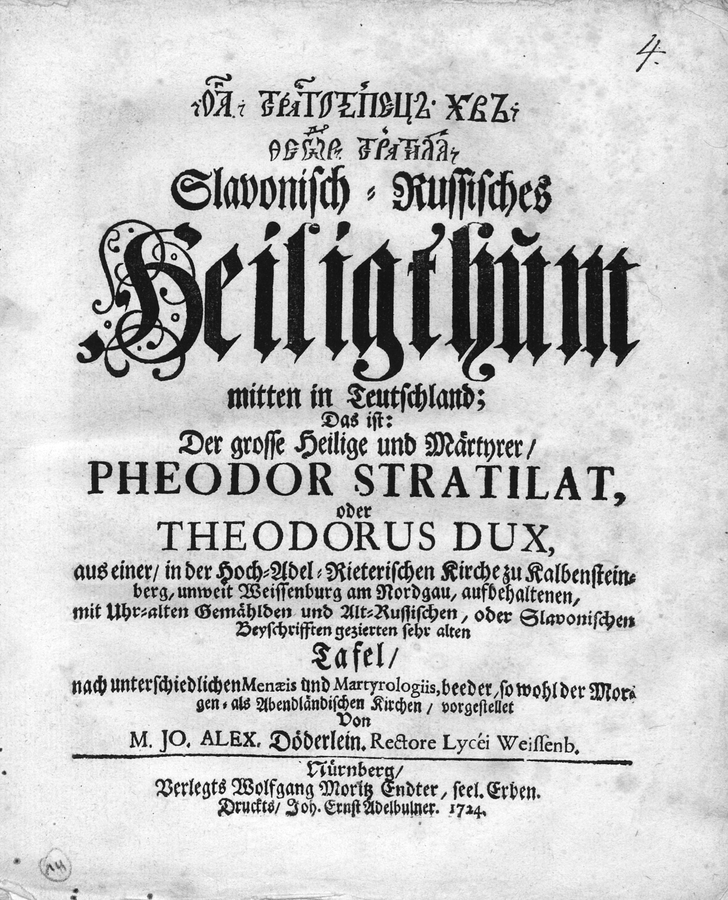 Doederlein, Johann Alexander. Slavonisch-Russisches Heiligthum mitten in Teutschland. 142, 8 S., 1 Bl. Geheftet (ohne Einband). 22,5 x 18 cm. Nürnberg, Endter, 1724.