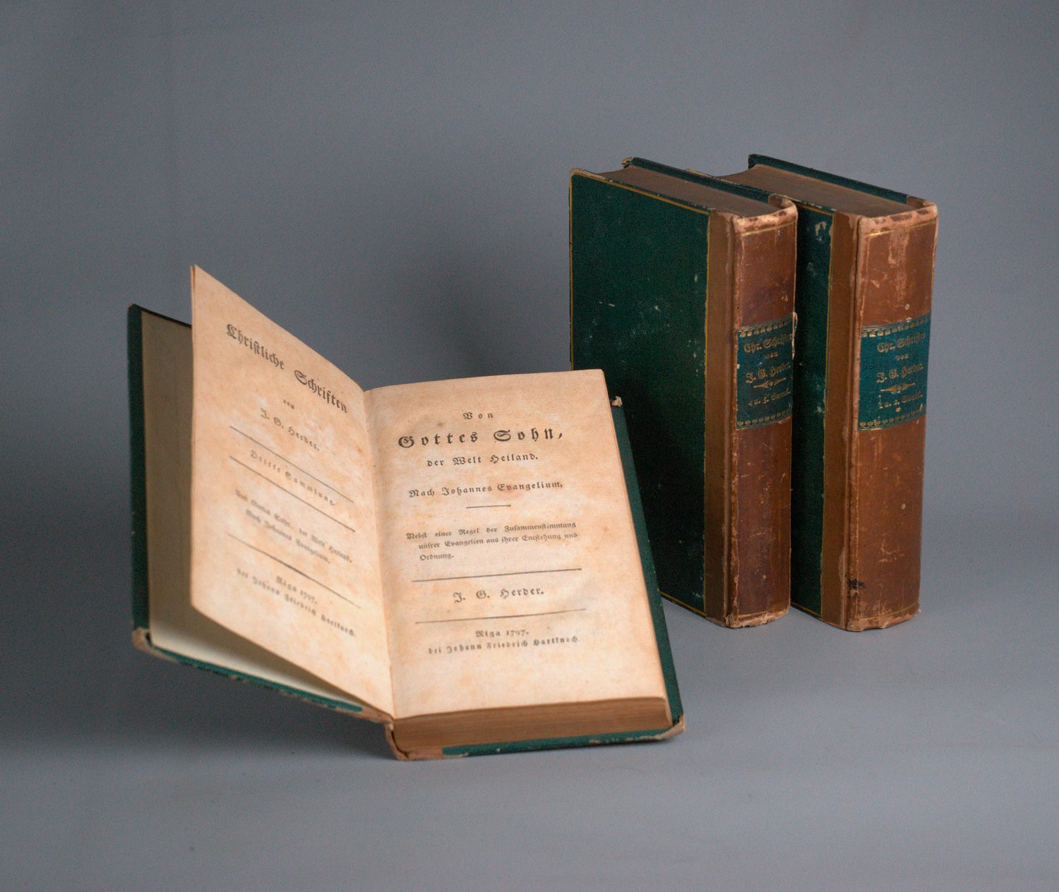 Herder, Johann Gottfried. Christliche Schriften. Teil 1-5 (von 5) in 3 Bänden. 16 x 9,5 cm. Pappband d. Z. (berieben und bestoßen) mit goldgeprägtem RSchild. Riga (später: Leipzig), Hartknoch, 1794-1798.