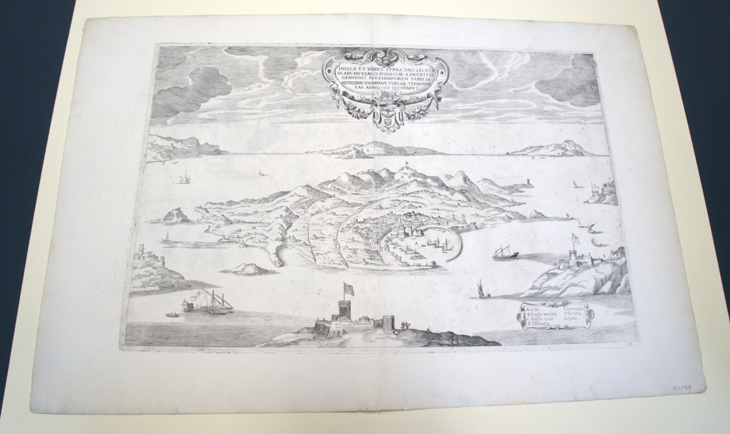 Chios. Insulae et urbes supra duo secula in archipelago possessae a patritia Genuensi. Kupferstich. 37,5 x 57 cm (Passepartout) bzw. 47,5 x 72,5 cm (Blatt). Mit Passepartout. Italien um 1630.