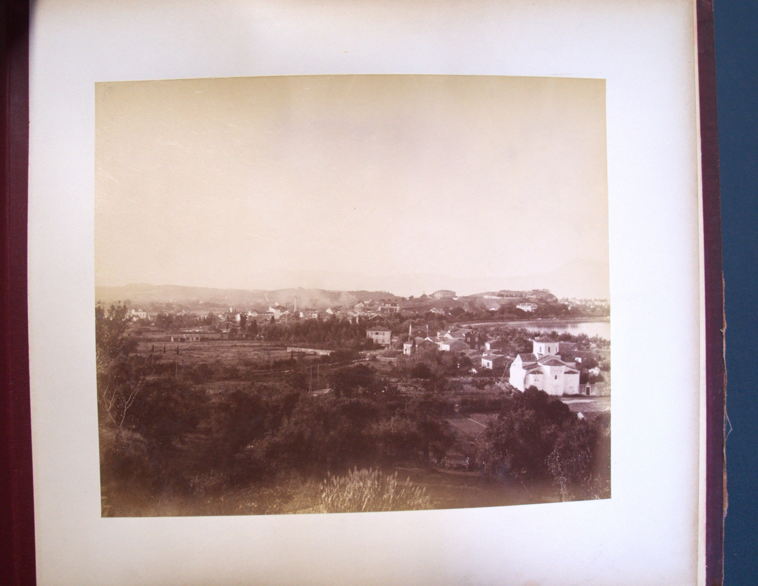 Schönes Souveniralbum mit zwölf größeren Ansichten (Format: ca. 21,5 x 24,5 cm) des Hauptortes Kerkyra und seines Hafens, Schloss Mon Repos auf der Kanoni-Halbinsel, der Siedlung Potamos ("Fotografia B. Rorri"), ferner von der vorgelagerten Insel Pontikonissi, Paliokastro etc. Am Schluss mit drei Darstellungen lokaler Bewohner in der traditionellen Inseltracht, diese im kleineren Format (ca. 13,5 x 9,5 cm). Auf dem fl. Vorsatz aus Seidenmoiree in Golddruck "Weihnachten E. R. 1889" – Die Photos teils etwas berieben.