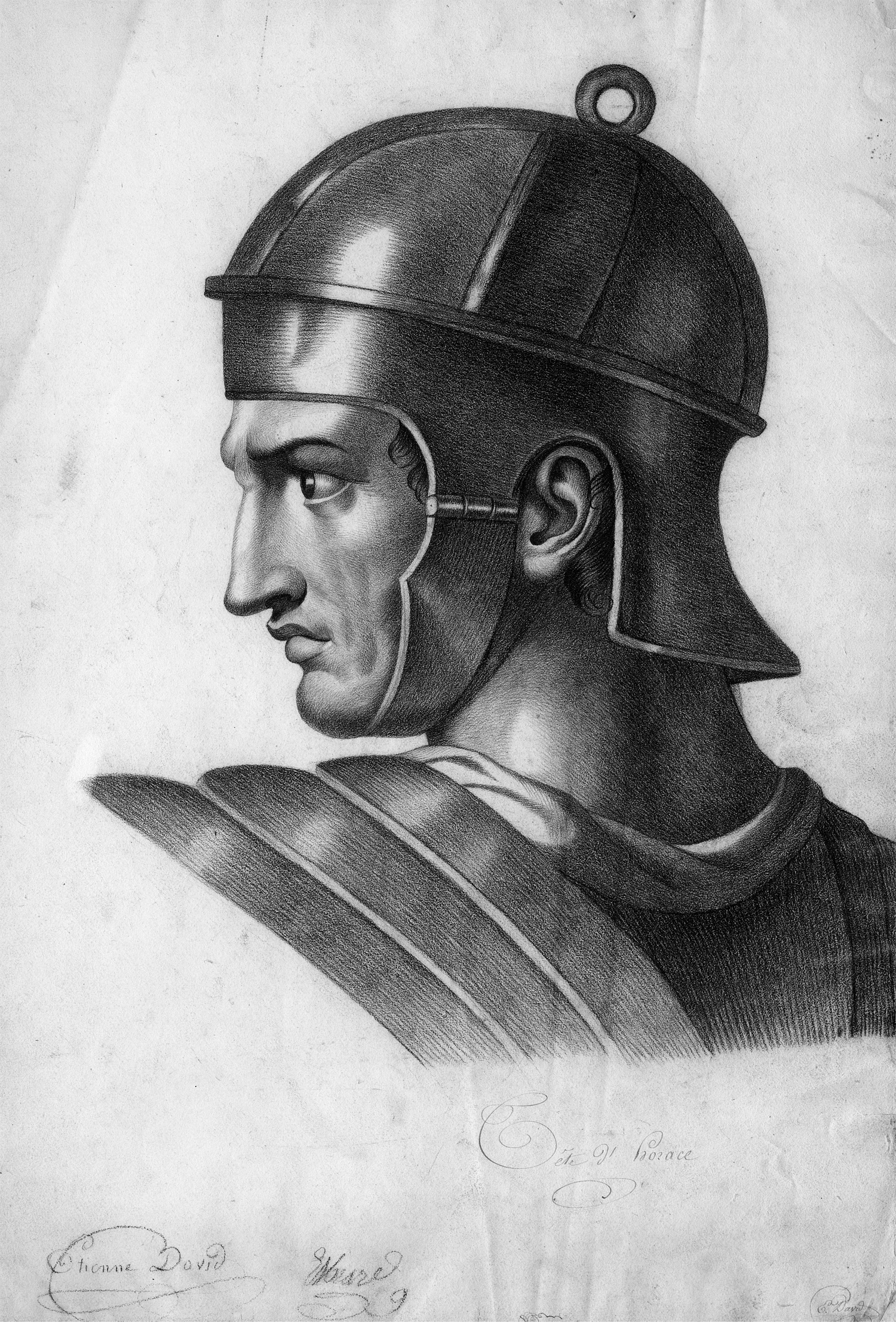 Dargestellt sind drei Kopfstudien von römischen Soldaten und Gelehrte. Dabei zeigt eine Studie des römischen Lyriker Horatius. – Papierbedingt gebräunt, mit kleinen Einrissen und Randläsuren sowie knickpsurig. Dekorativ.