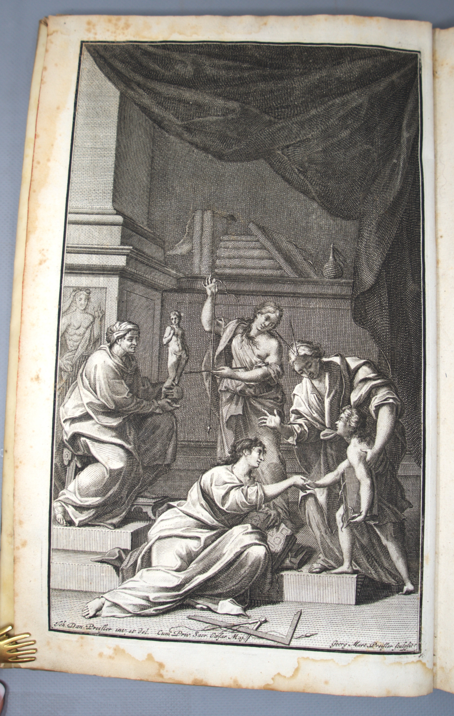 Preissler, Johann Daniel. Die durch Theorie erfundene Practic, oder gründlich-verfasste Reguln deren man sich als Anleitung zu berühmter Künstlere Zeichen-Wercken bestens bedienen kan. Teil I-III in 1 Band. 8 Bl.; 4 Bl.; 4 Bl. Mit gestochenem Frontispiz und 54 Kupfertafeln. 36 x 22 cm. Pergament d. Z. (etwas fleckig, gewellt und mit Kratzspuren) mit RTitel. Nürnberg, Johann Daniel Preissler, 1728-1732.