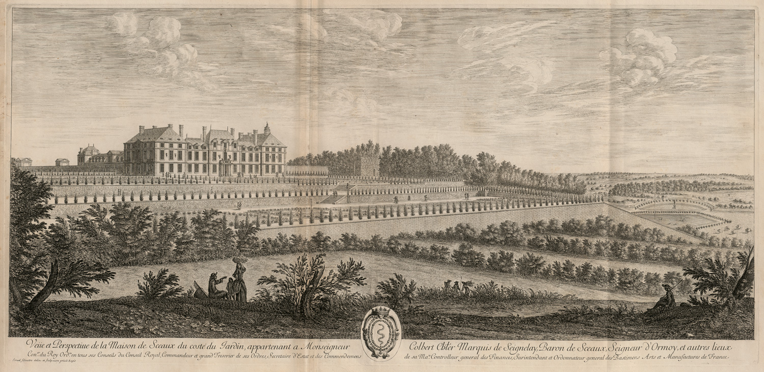Sammelband mit teils prächtigen Darstellungen barocker Gartenanlagen und herrschaftlicher Paläste in Frankreich und Italien, kompiliert aus verschiedenen graphischen Folgen und gestochen zumeist von Künstlern wie Johann Battista Falda, Dominique Barrière, Arnold van Westerhout, Giacomo de Rossi und Israël Silvestre. Neben malerischen Ansichten auch mit architektonischen Grundrissen, Plänen, Fassaden, Triumphbögen etc. U. a. "Chateau de Lauardin", Petersplatz, "Giardino di Belevedere", "Giardino del Duca di Toscana", "Giardino el Duca di Parma", verschiedene Gärten in Rom und im Vatikan, Orangerie der Kurfürstin Louise von Brandenburg", "Arc de Triomphe", "Plan general de Versailles", "Chasteau de Fontaine Belleau" usw. – Teils mit größerem und unschönem Feuchtigkeitsrand, einige Tafeln gleichmäßig gebräunt, insgesamt mal mehr, mal weniger fleckig, Teils gestempelt.