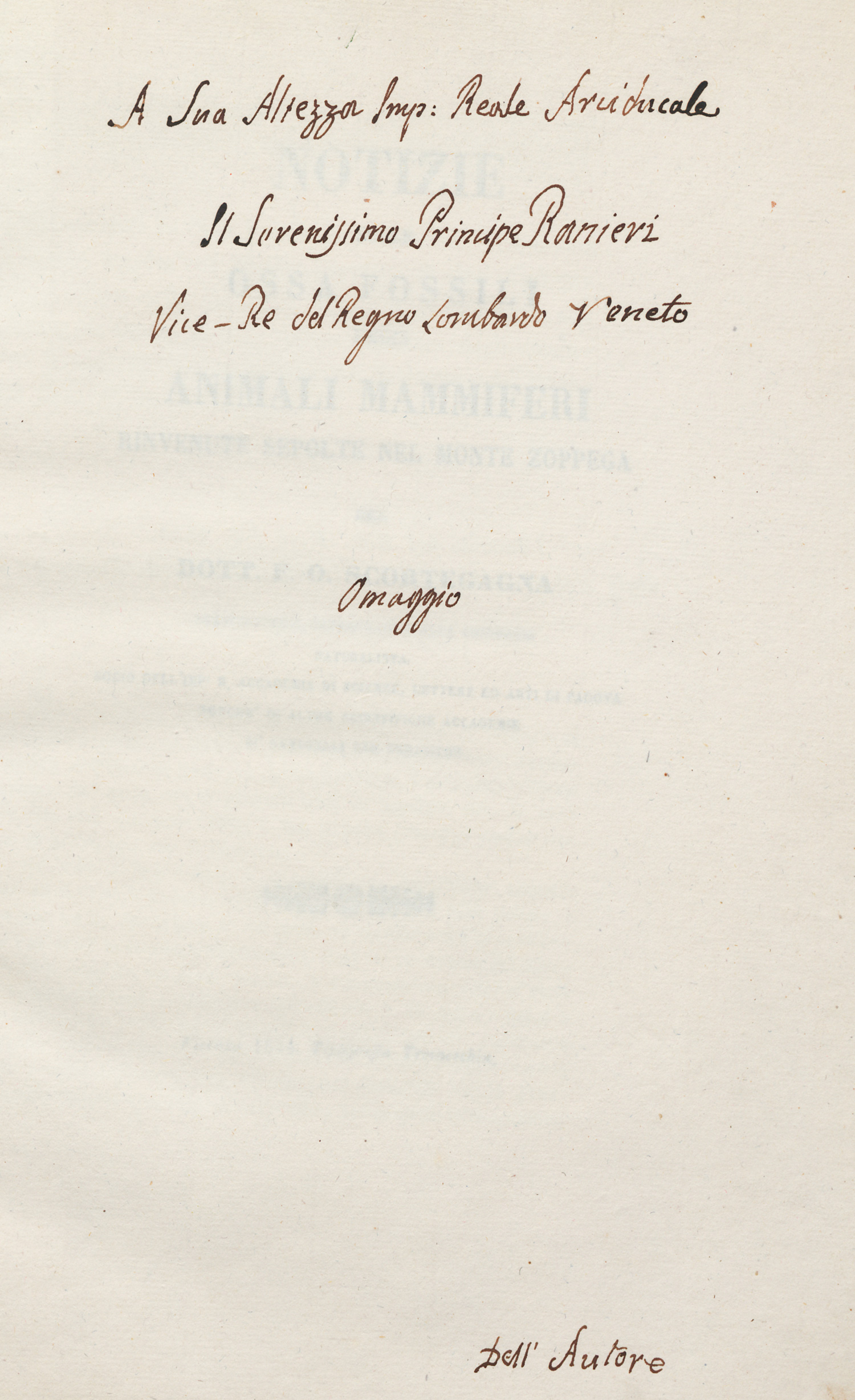 Bericht über Ausgrabungen am Monte Zoppega in der Provinz Verona. Die Tafeln zeigen den Fundort und die ausgegrabenen Knochenstücke. Vorsatz mit eigenhändiger Widmung des Autors. – Sehr gut erhalten.