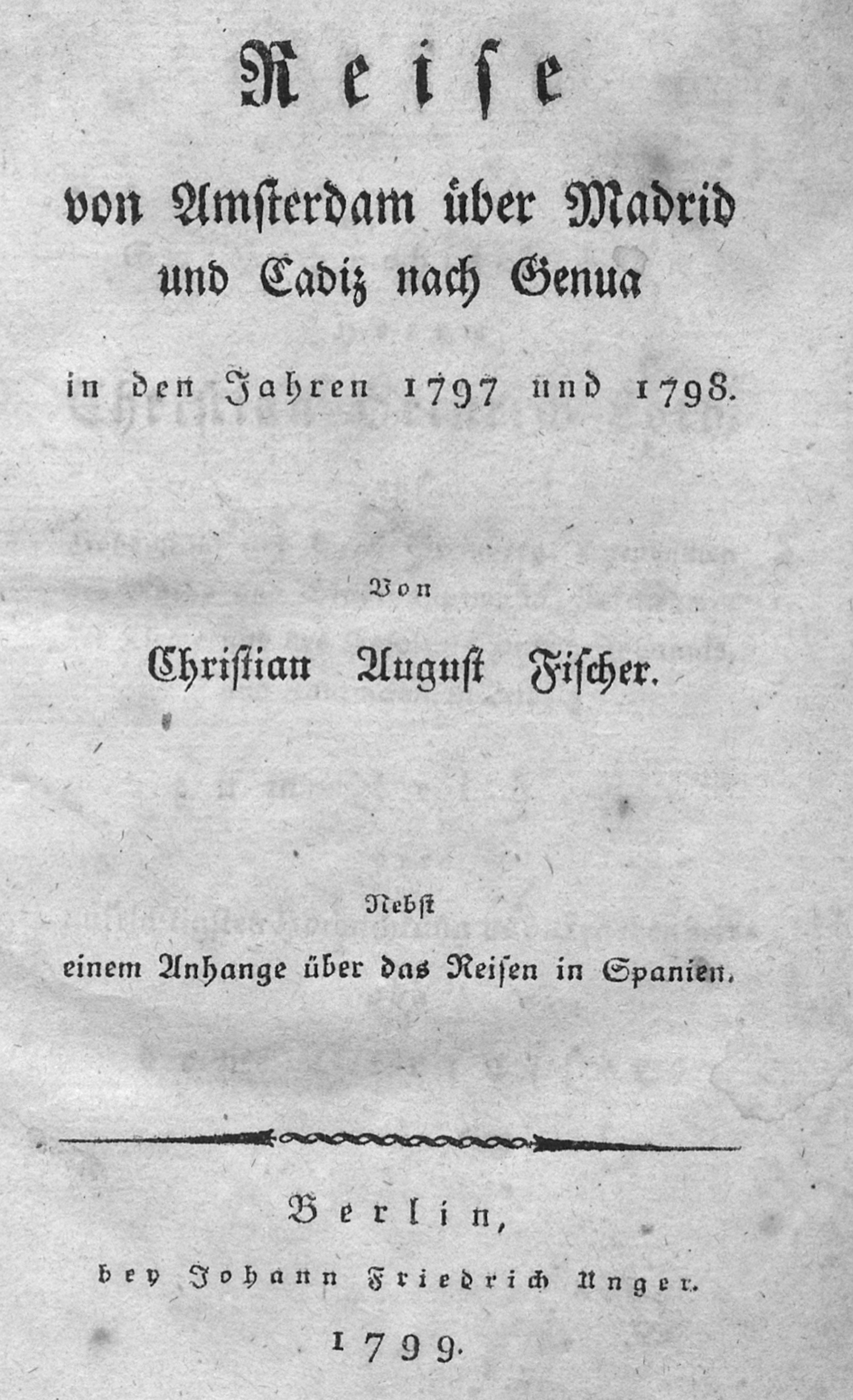 Fischer, Christian August (Hrsg.). Reise von Amsterdam über Madrid und Cadiz nach Genua in den Jahren 1797 und 1798. Nebst einem Anhange über das Reisen in Spanien. XXII, 526 S., 1 Bl. 16 x 10 cm. Halbleder d. Z. (berieben, bestoßen und Rücken leicht verblichen) mit goldgeprägtem RSchild. Berlin, Johann Friedrich Unger, 1799.