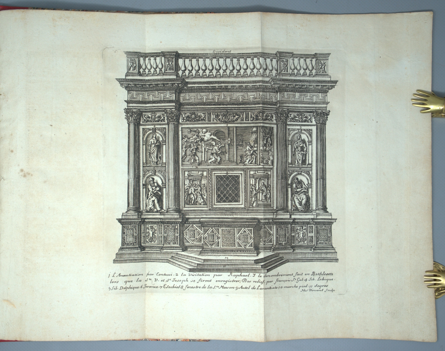 Vincent, Hubert. Die vier Seitenwände in "Santa Casa di Loretto". Mehrfach gefaltetes Erklärungsblatt (alt aufgezogen) und 4 gefaltete Kupfertafeln von H. Vincent. 31 x 21 cm. Neuerer Halblederband mit goldgeprägtem RTitel. (Rom 1686).